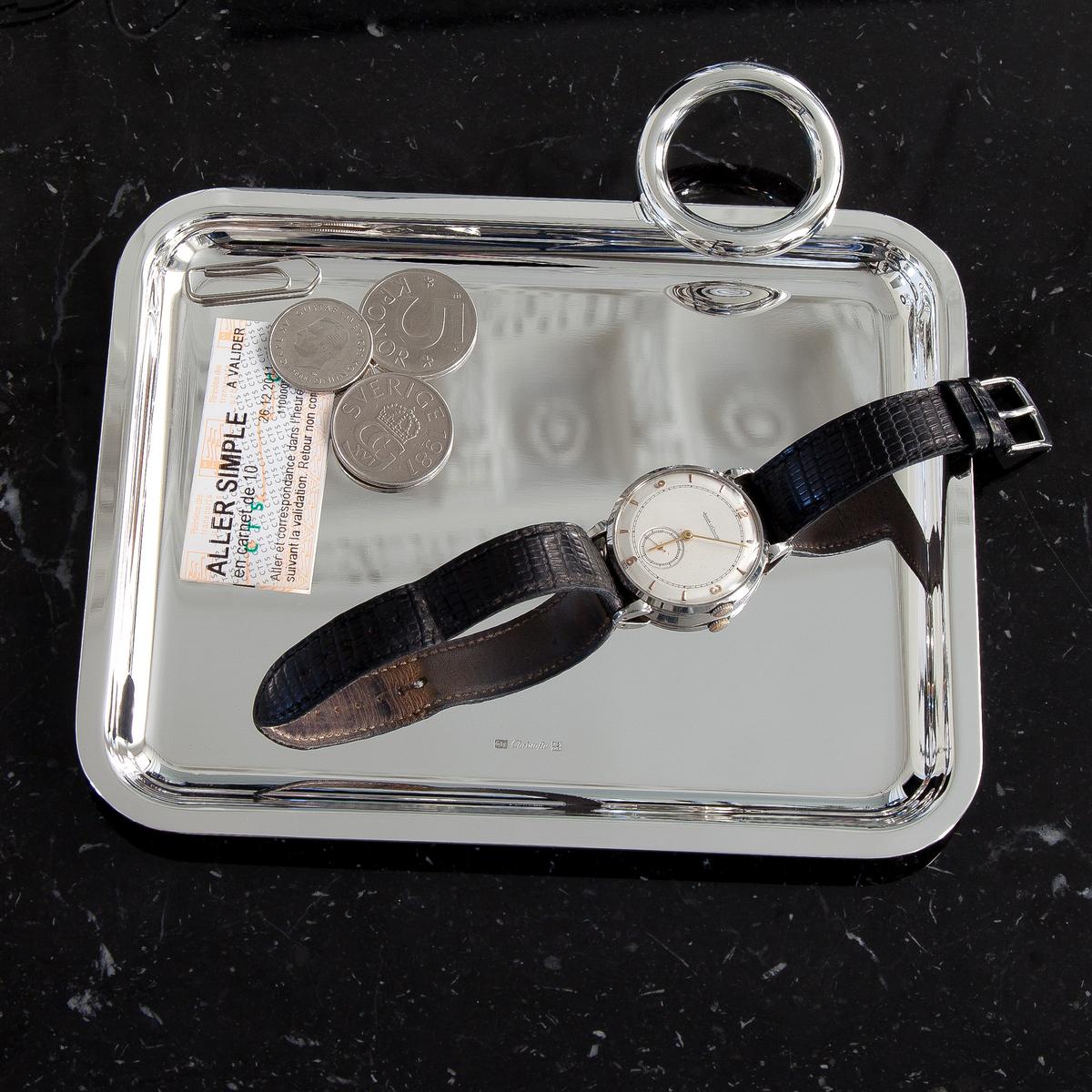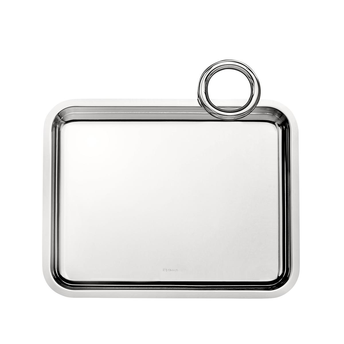 Auch die Pralinen zum Kaffee wollen stilvoll serviert werden. Zum Beispiel auf diesem kleinen, versilberten Tablett von Andrée Putman. Der geschwungene Ring ist das Leitmotiv der gesamten Kollektion "Vertigo" von Christofle. Weitere Tabletts von "Vertigo" finden Sie unten.