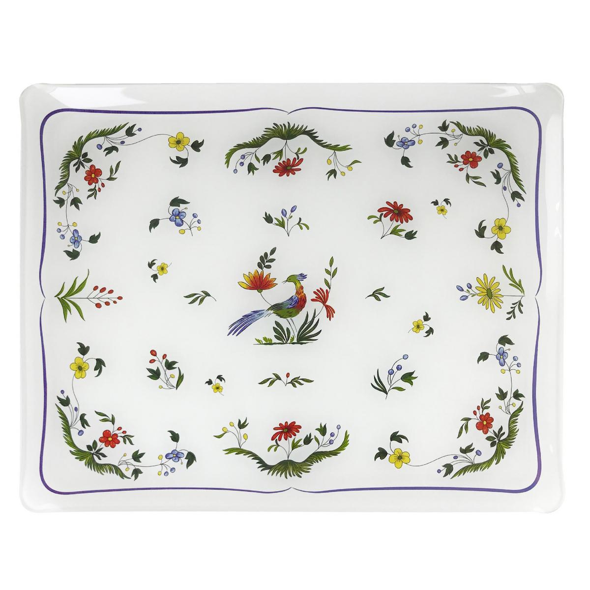 Gien gestattet vielen der beliebten Dekore seines Tafelgeschirrs eine erheblich breitere Entfaltung als auf Tellern oder Tassen. Etwa auf 46,4 x 36,4 cm Zentimetern als Illustration tragfähiger Serviertabletts. Im kleineren Format ist das jeweilige Acryl-Tablett 37 x 28,3 Zentimeter groß.