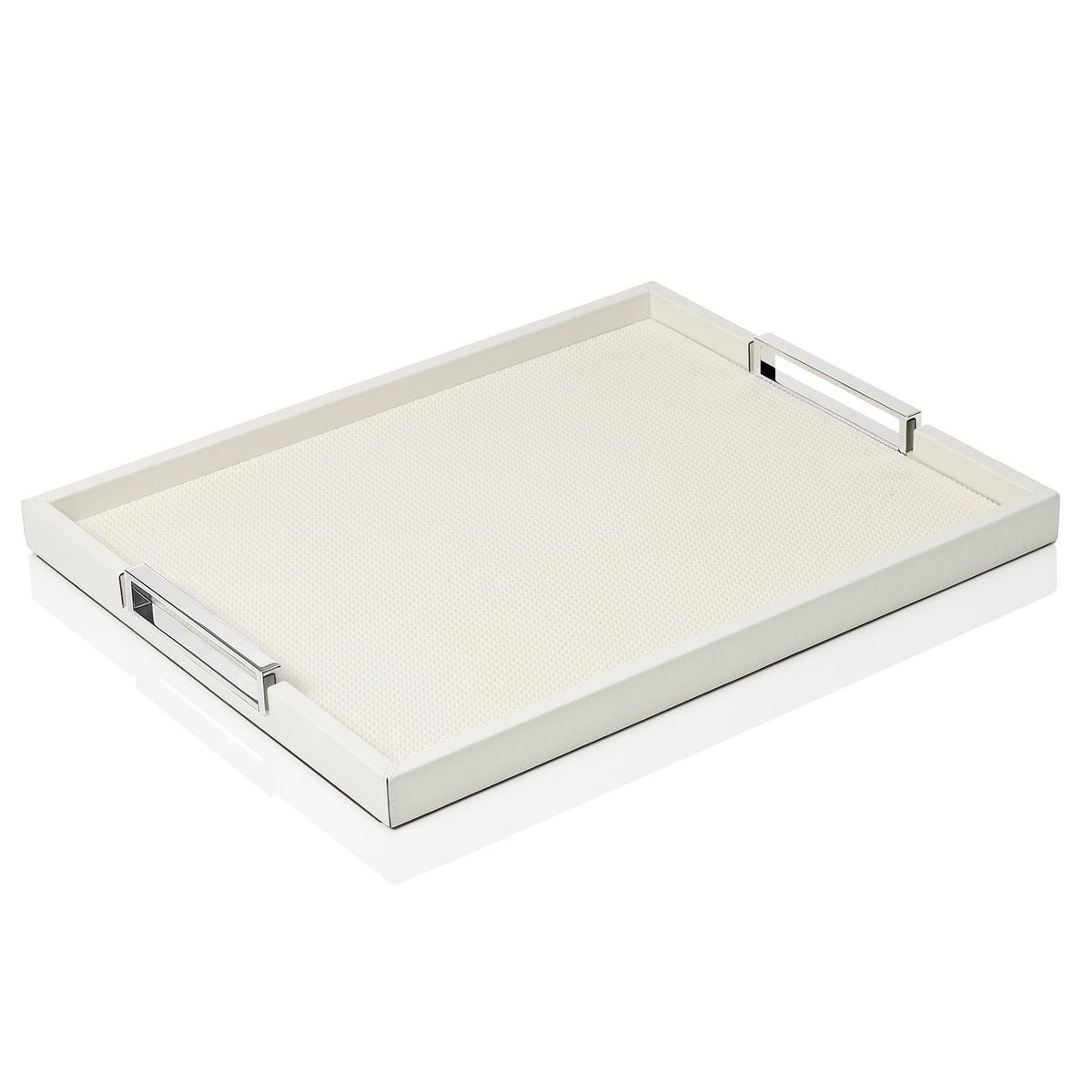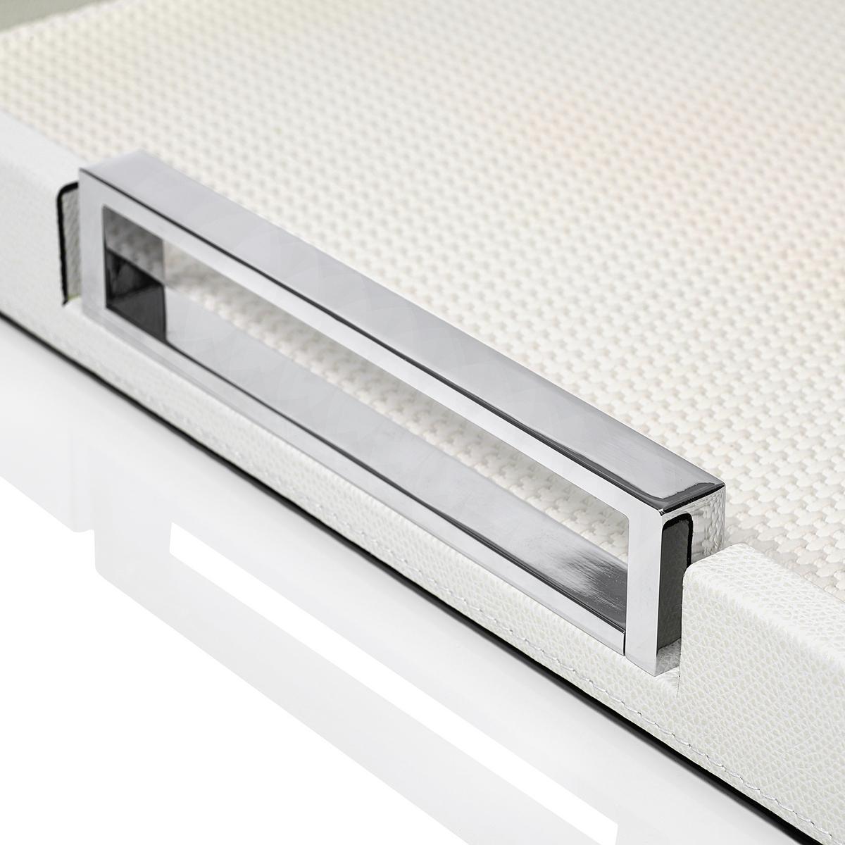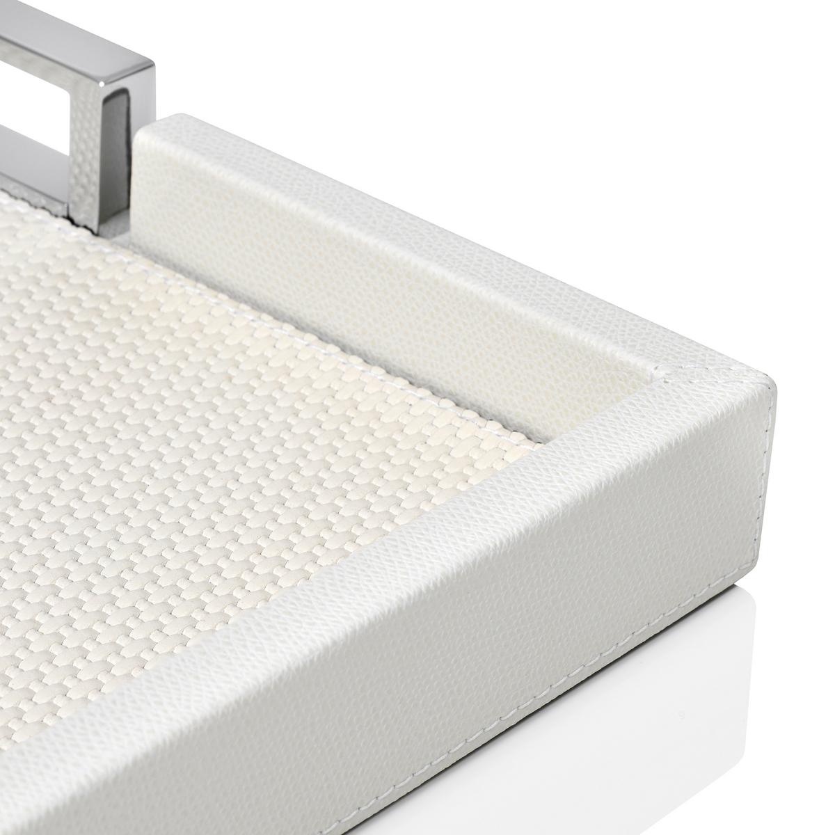 Die Tabletts "Victor" von GioBagnara bestehen aus stabilem Holz, welches mit hochwertigem Kalbsleder in reiner Handarbeit ummantelt wird. Die Stellfläche der Tabletts ist aus geflochtenem, fein strukturiertem Rindsleder. Die Ränder sind aus glattem Kalbsleder in der gleichen Farbe. Sehr handlich sind die verchromten Griffe des praktischen Serviertabletts "Victor".