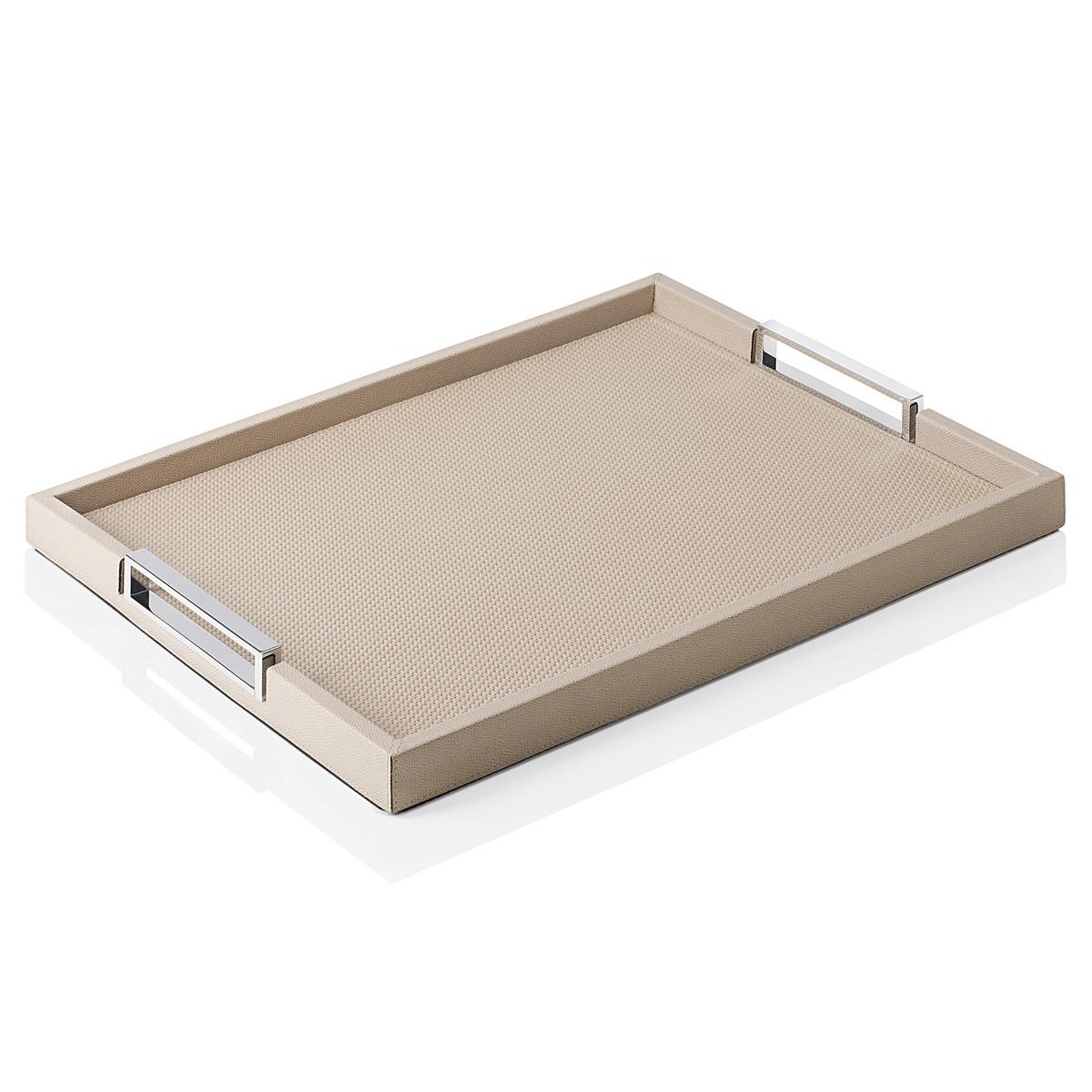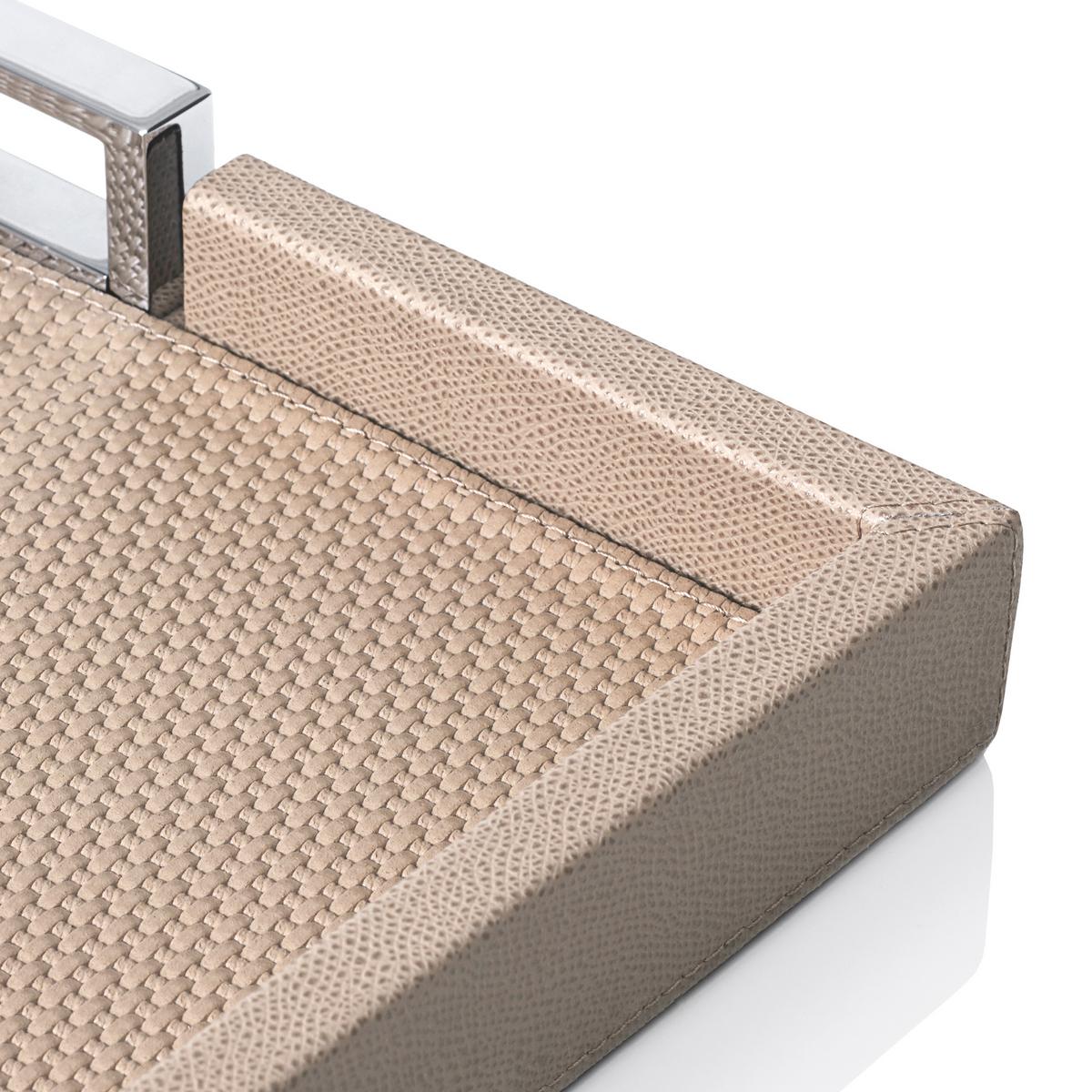Die Tabletts "Victor" von GioBagnara bestehen aus stabilem Holz, welches mit hochwertigem Kalbsleder in reiner Handarbeit ummantelt wird. Die Stellfläche der Tabletts ist aus geflochtenem, fein strukturiertem Rindsleder. Die Ränder sind aus glattem Kalbsleder in der gleichen Farbe. Sehr handlich sind die verchromten Griffe des praktischen Serviertabletts "Victor".
