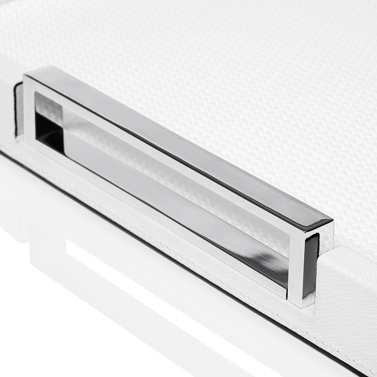 Die Tabletts "Victor" von GioBagnara bestehen aus stabilem Holz, welches mit hochwertigem Kalbsleder in reiner Handarbeit ummantelt wird. Die Stellfläche der Tabletts ist aus geflochtenem, fein strukturiertem Rindsleder. Die Ränder sind aus glattem Kalbsleder in der gleichen Farbe. Sehr handlich sind die verchromten Griffe des praktischen Serviertabletts "Victor".