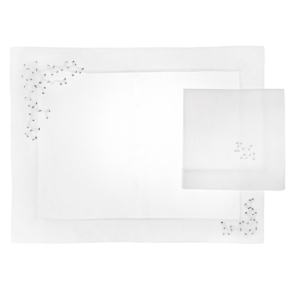 Einen Hauch von Südsee Feeling zaubert die Tischwäsche "Koralle Weiß-Silber" auf Ihren Tisch. Die gestickten weißen Korallen besitzen edle Akzente in Silber. Durch ihre schlichte Eleganz passt die Baumwolltischwäsche von Eri Textiles gut zu unterschiedlichen Tischdekorationen.