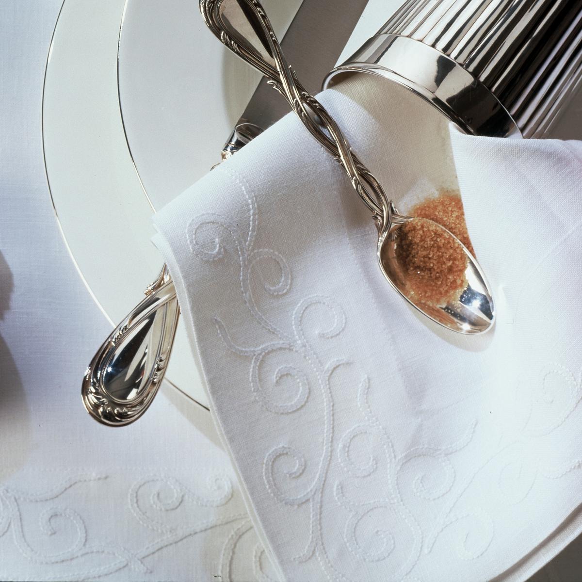 Hübsch geschwungene Arabesken zieren Servietten, Platzsets, Läufer und Tischdecken. Die Verzierungen wurden Ton in Ton und von Hand auf das weiße Leinen gestickt. Die Tischwäsche lässt sich sehr gut sowohl mit klassischen als auch modernen Servicen kombinieren. Auf Wunsch werden auch Tischdecken in Sondermaßen angefertigt (Sondermaße nur auf Leinen möglich, Lieferzeit zwei bis drei Monate).