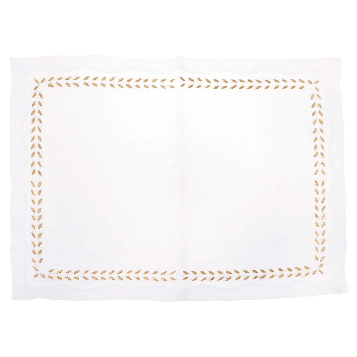 Die Leinentischwäsche "Doppelte Marie" von Eri Textiles verzaubert auf den ersten Blick. Viele stilisierte kleine Blätter in Gold bzw. Silber säumen das rein weiße Leinen. Eine wellenförmige Bestickung am Rand bildet einen gelungenen Rahmen für die Tischwäsche aus 100% Leinen.