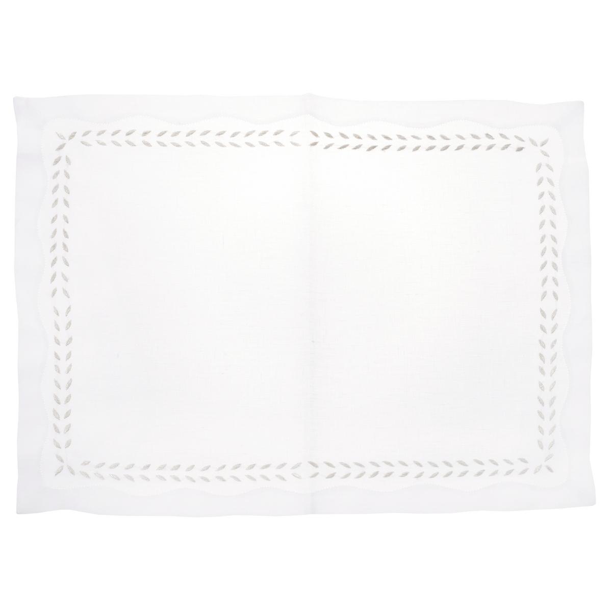 Die Leinentischwäsche "Doppelte Marie" von Eri Textiles verzaubert auf den ersten Blick. Viele stilisierte kleine Blätter in Gold bzw. Silber säumen das rein weiße Leinen. Eine wellenförmige Bestickung am Rand bildet einen gelungenen Rahmen für die Tischwäsche aus 100% Leinen.