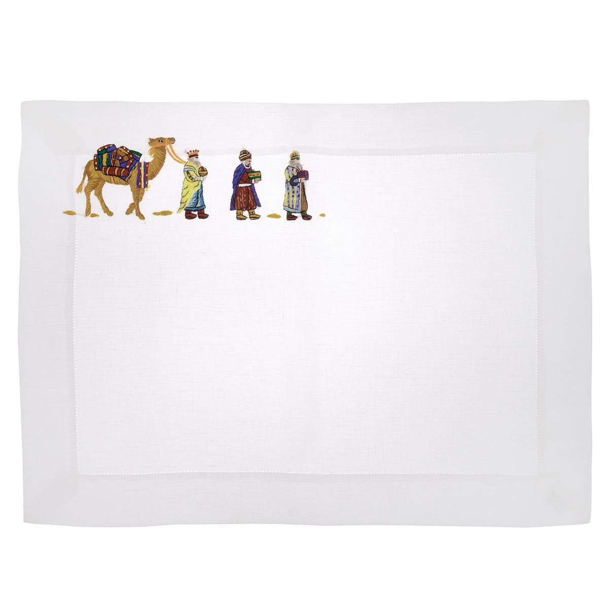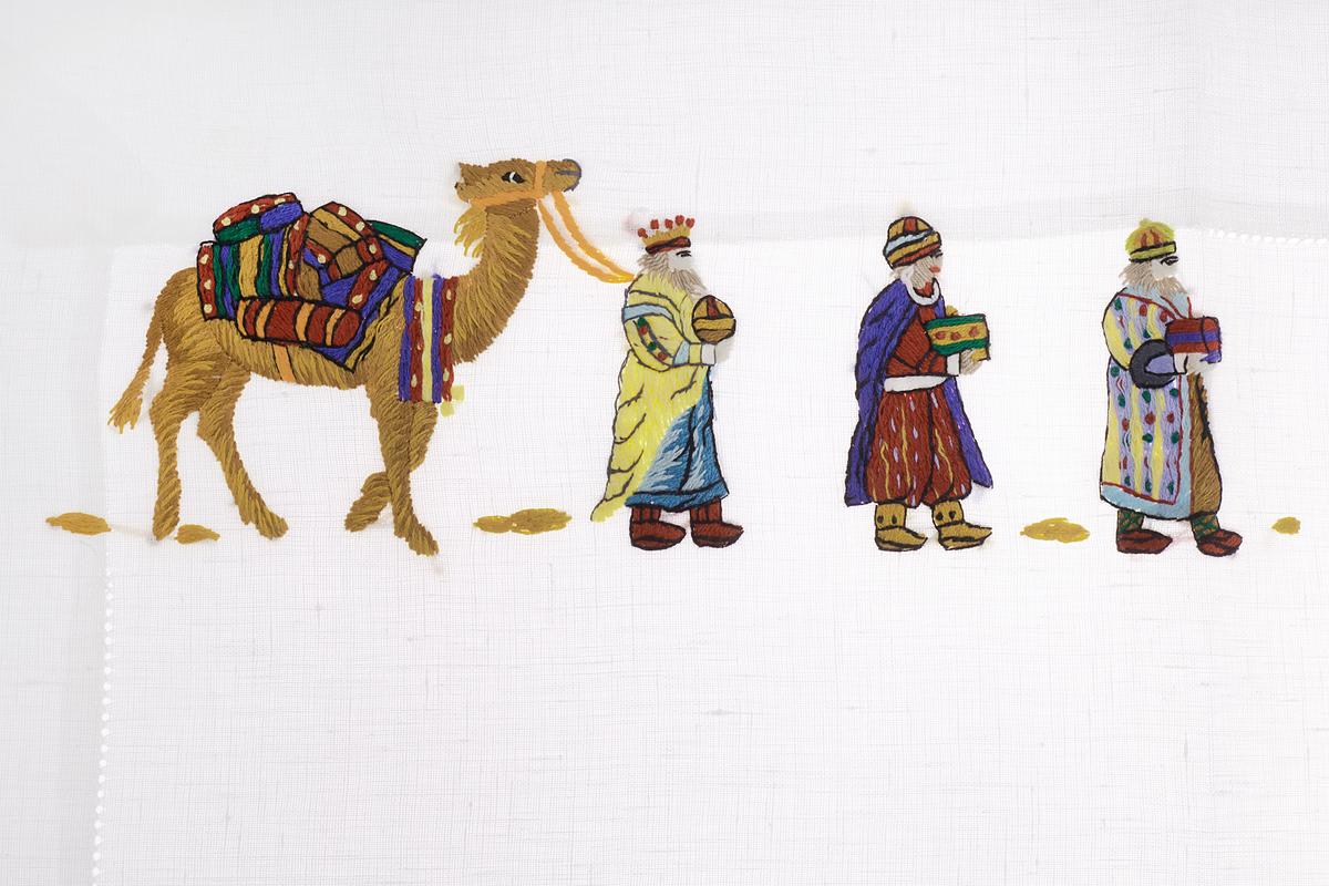 An Palmen vorbei zieht die kleine Karawane der "Heiligen Drei Könige" über elegantes, weißes Leinen. Die Tischwäsche von Eri Textiles begeistert mit liebevollen Details und fein abgestimmten Farben und Schattierungen. Entworfen wurde die Leinentischwäsche "Heilige Drei Könige" von Erika Lassen. Erfahrene Stickerinnen setzen das detailreiche Motiv in aufwendiger Handarbeit im Atelier von Eri Textiles um.