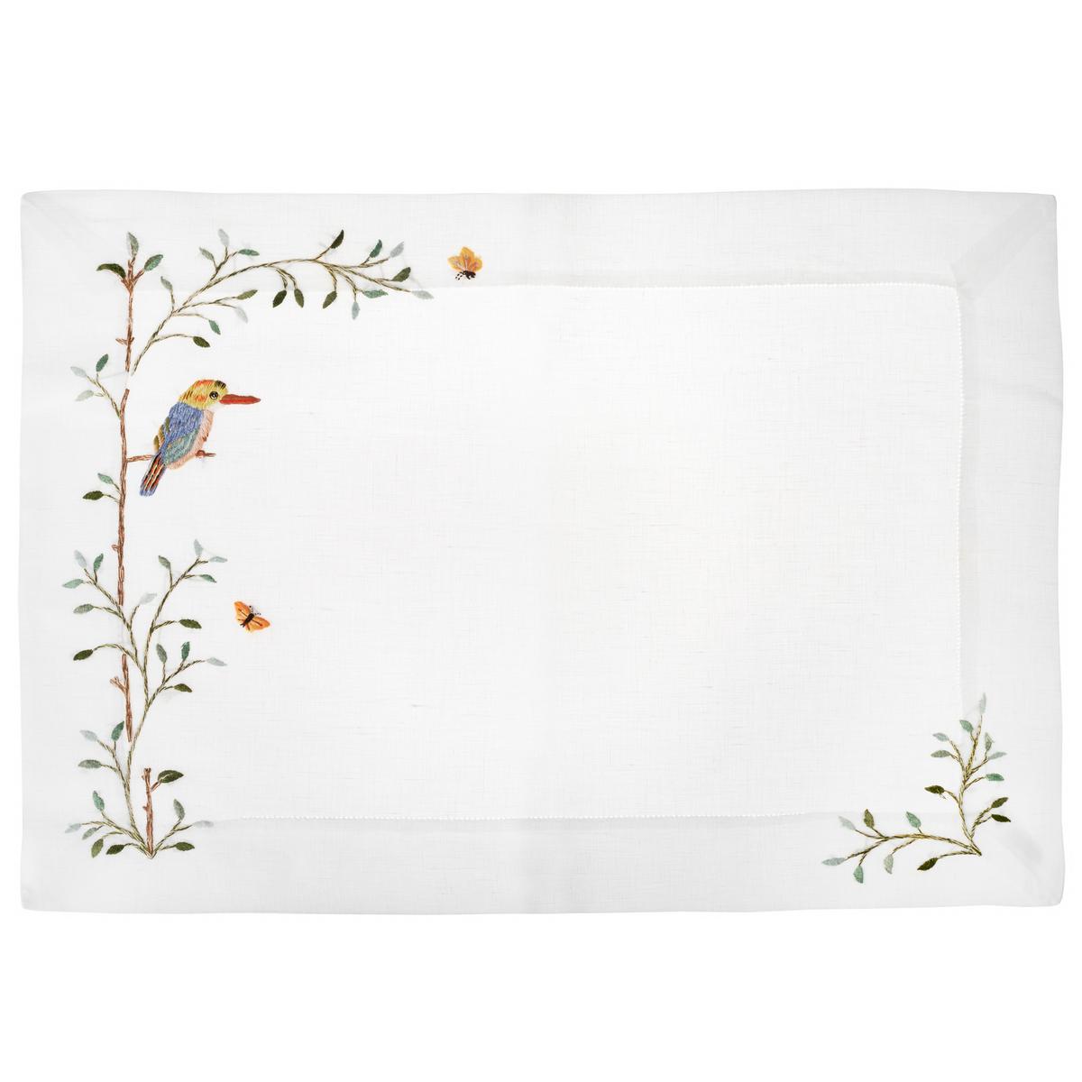 Die Leinentischwäsche "Vögel" wird in liebevoller Handarbeit von der Firma Eri Textiles angefertigt. Der buntgefiederte Vogel, der einem Kolibri ähnelt, kommt auf dem weißen Leinengrund schön zur Geltung. Eingerahmt ist er von feingliedrigen Blättern in verschiedenen Grüntönen. Zur Auswahl stehen Servietten, Platzsets, Läufer und Tischdecken. Das 6er-Set Servietten besteht aus 3 Servietten mit Vogelmotiv und 3 Servietten mit Blättermotiv. Auf dem Läufer und den Tischdecken ist der niedliche Vogel mehrmals vertreten.