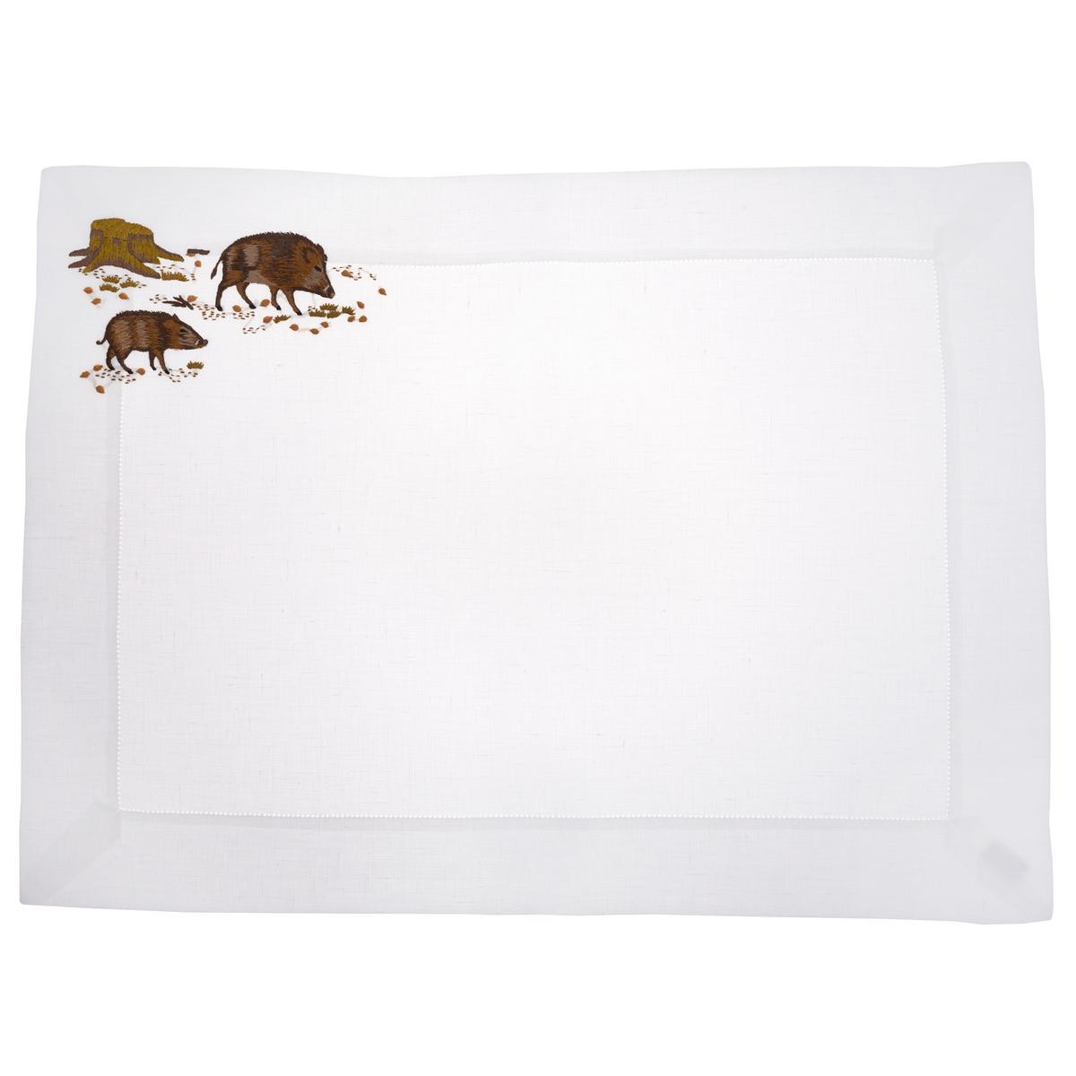 Die Tischwäsche "Wildschwein" von Eri Textiles macht Ihre Tafel winterfein: Servietten und Platzsets aus 100% Leinen sind mit Wildschweinen bestickt.
