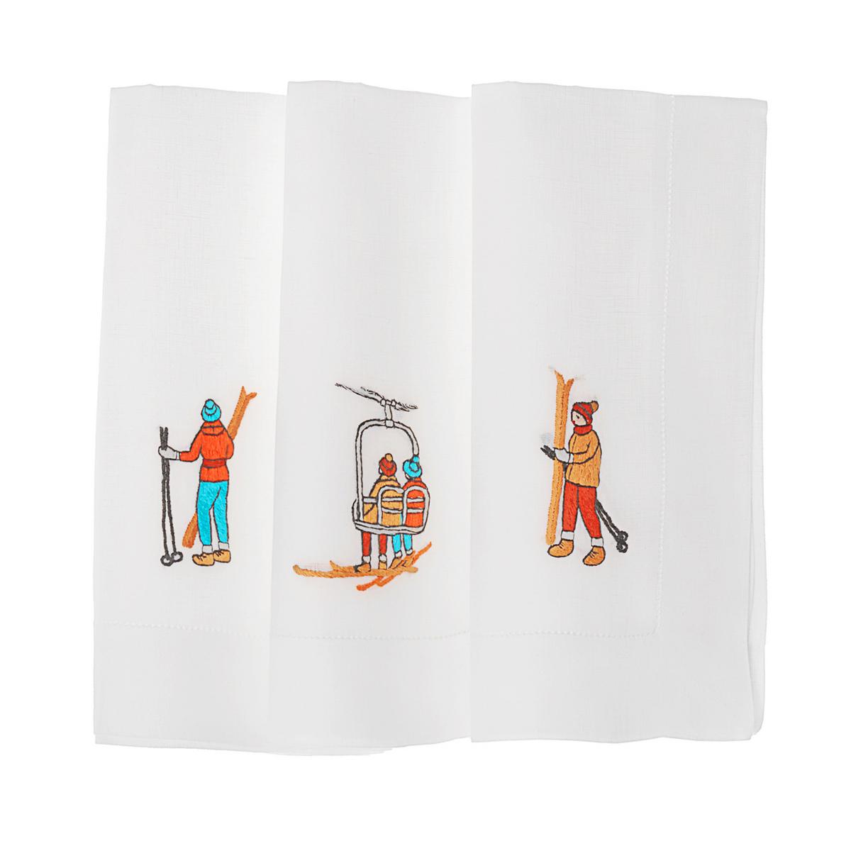 Schüren Sie die Vorfreude auf die nächste Abfahrt mit der Leinentischwäsche "Auf'i geht's" von Eri Textiles. Die Servietten, Platzsets und Cocktailservietten sind handbestickt mit drei stimmungsvollen Dessins von putzigen Skifahrenden auf ihrem Weg zur Piste. Ein gefasster Hohlsaum umrahmt die Motive und verleiht dem reinen Weiß des puren Leinenstoffes die Anmut einer weiten Schneelandschaft. Ob für die Berghütte, das Ferienhaus oder den heimischen Tisch, "Auf'i geht's" bringt Ski-Begeisterte für die gesamte Saison zum Träumen.