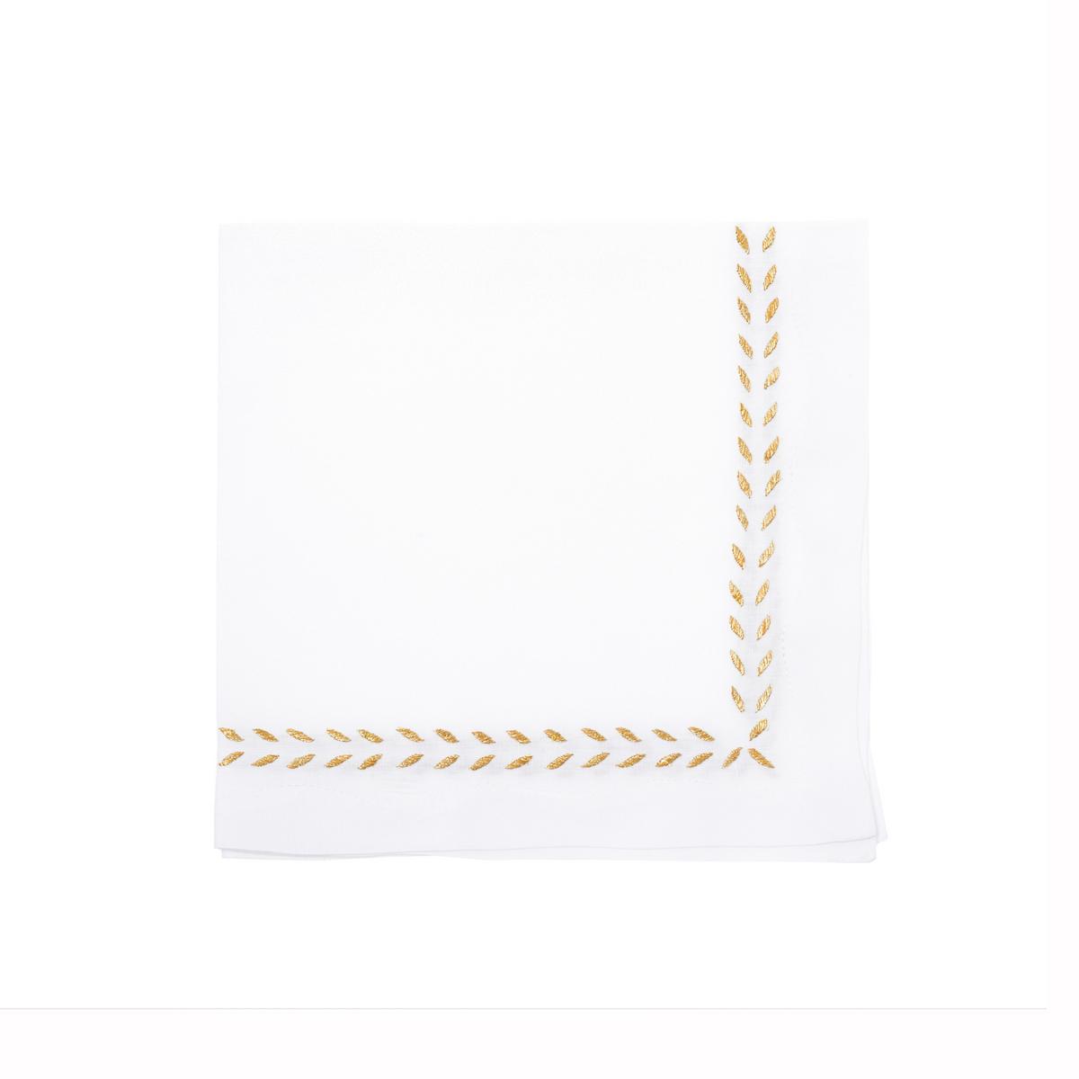 Die Leinentischwäsche "Doppelte Marie" von Eri Textiles verzaubert auf den ersten Blick. Viele stilisierte kleine Blätter in Gold bzw. Silber säumen das rein weiße Leinen. Eine wellenförmige Bestickung am Rand bildet einen gelungenen Rahmen für die Tischwäsche aus 100% Leinen.