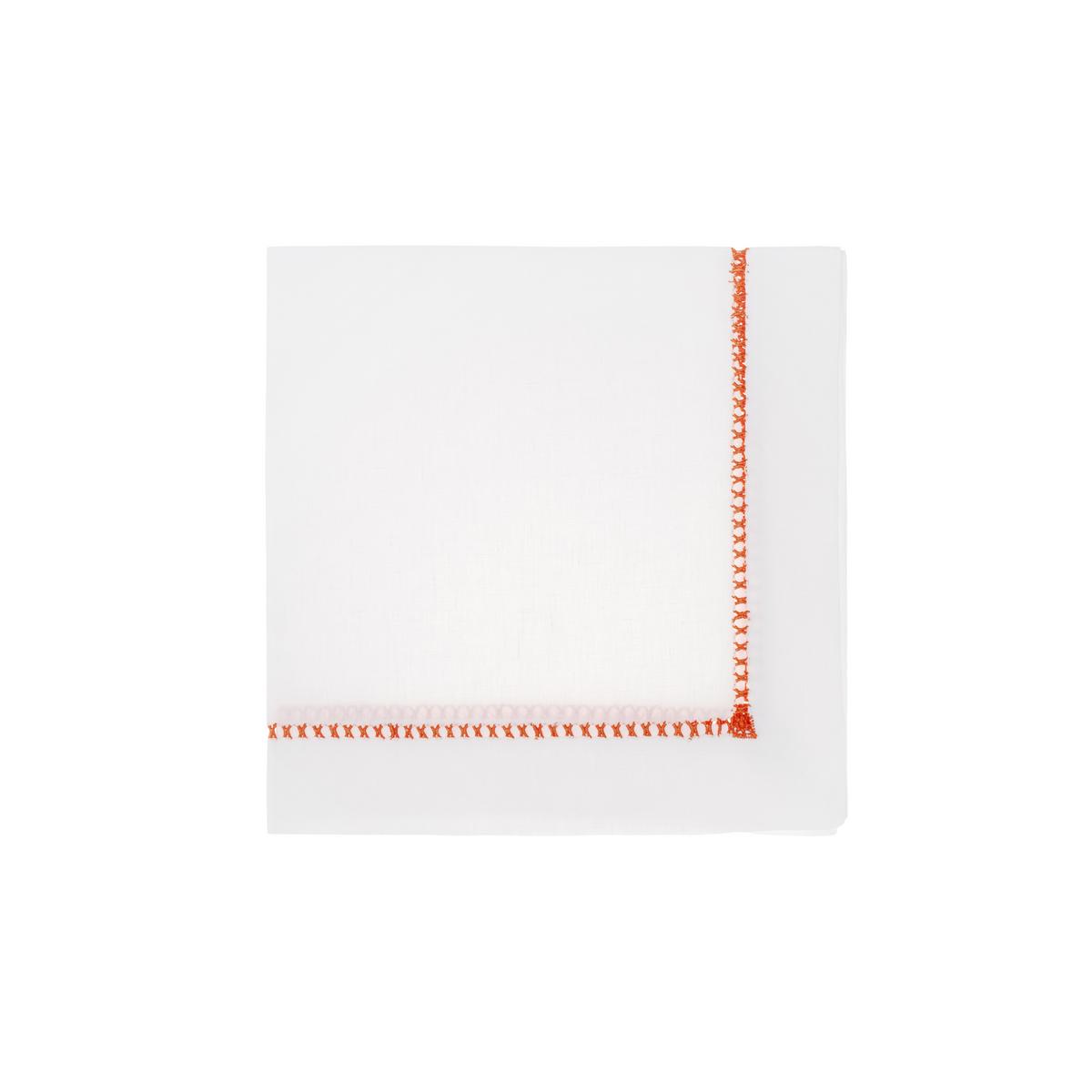 Ein auffälliger gestickter Hohlsaum in der Farbe Orange ziert die Leinentischwäsche "Schildsaum" von Eri Textiles. Das weiße Leinen und der in aufwendiger Handarbeit gestickte Hohlsaum wirken frisch und leicht. Durch das schlichte Design ist die Tischwäsche vielseitig einsetzbar.