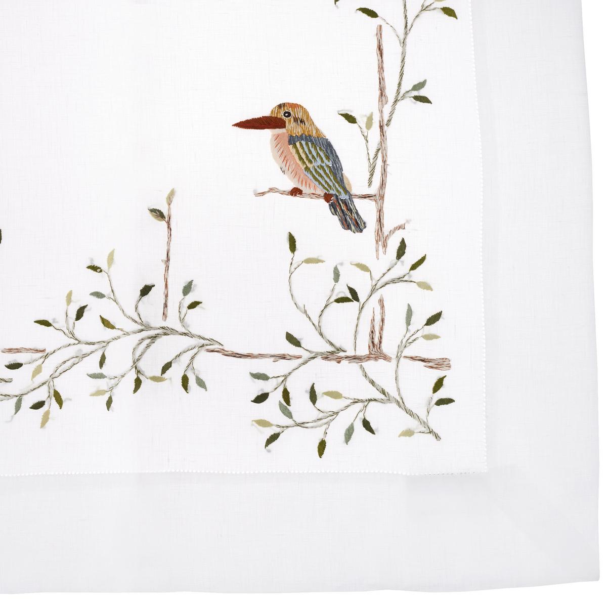 Die Leinentischwäsche "Vögel" wird in liebevoller Handarbeit von der Firma Eri Textiles angefertigt. Der buntgefiederte Vogel, der einem Kolibri ähnelt, kommt auf dem weißen Leinengrund schön zur Geltung. Eingerahmt ist er von feingliedrigen Blättern in verschiedenen Grüntönen. Zur Auswahl stehen Servietten, Platzsets, Läufer und Tischdecken. Das 6er-Set Servietten besteht aus 3 Servietten mit Vogelmotiv und 3 Servietten mit Blättermotiv. Auf dem Läufer und den Tischdecken ist der niedliche Vogel mehrmals vertreten.