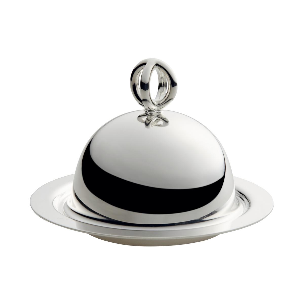 Charmant, glänzend und mit perfekten Rundungen ausgestattet überzeugt die Butterdose "Latitude" von Ercuis mit Kristallglaseinsatz auf dem Frühstückstisch und bei allen anderen Mahlzeiten. Über ihrer flachen Basis mit leicht erhöhtem Rand erhebt sich majestätisch eine versilberte Kuppel, die von zwei gekreuzten Ringen gekrönt wird. Sie dienen als Griff für den versilberten Deckel der Butterdose. Ein Designelement mit dem Ercuis das unverwechselbare Erscheinungsbild der Serie "Latitude" geprägt hat.