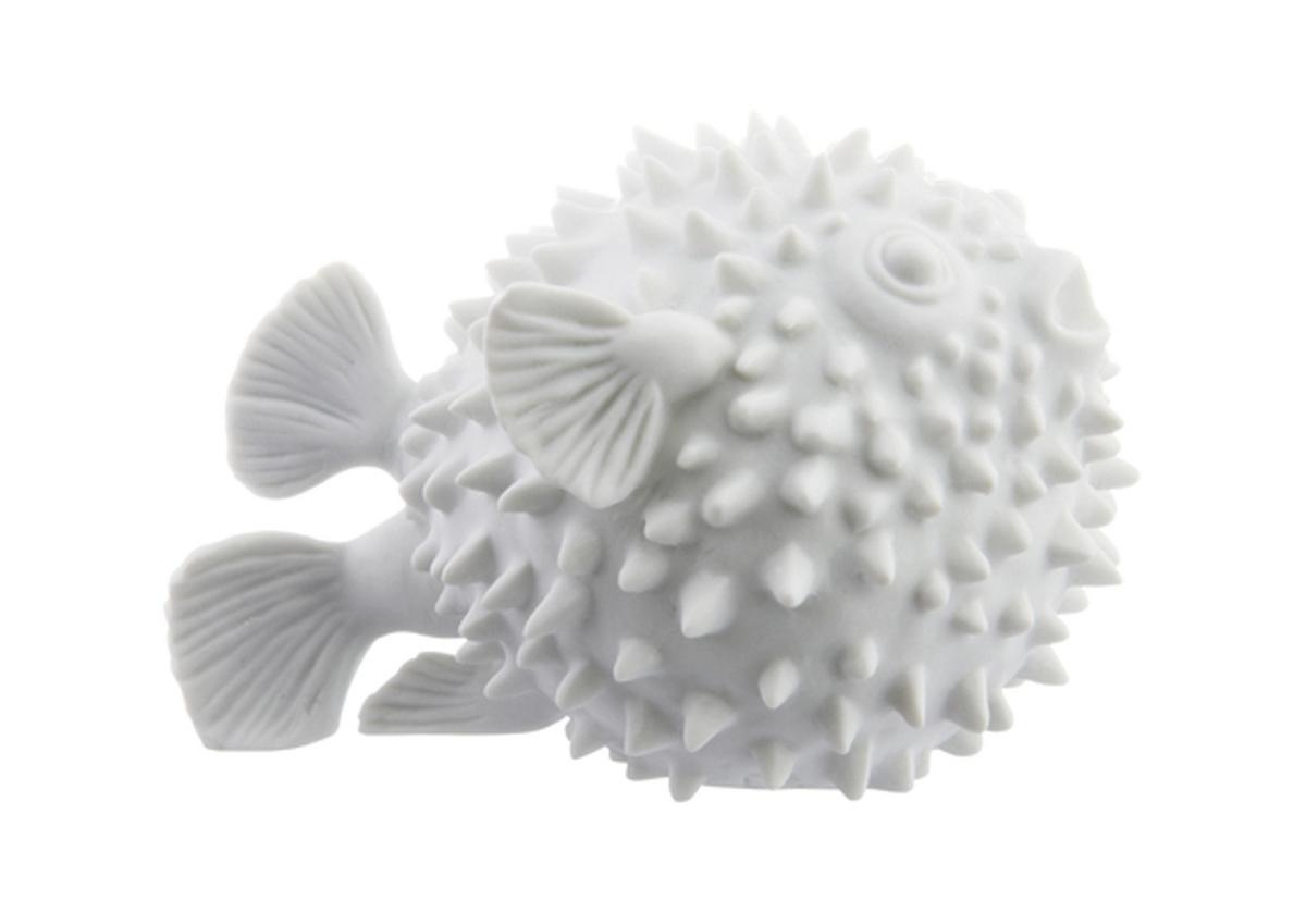 Fantasievoll, auffällig und ein Meisterwerk des Kunsthandwerks. Dieser Igelfisch aus weißem Biskuit-Porzellan der Traditionsmanufaktur Nymphenburg orientiert sich nicht unbedingt streng an der Natur. Stattdessen spielt er mit den exotischen Impressionen der Tropen. Dabei hinterlässt das Kunstwerk aus Porzellan einen prachtvollen Eindruck. Den sechs Zentimeter hohen Igelfisch hat Luise Terletzki-Scherf bereits 1958 für die Porzellanmeister aus Nymphenburg entworfen.
