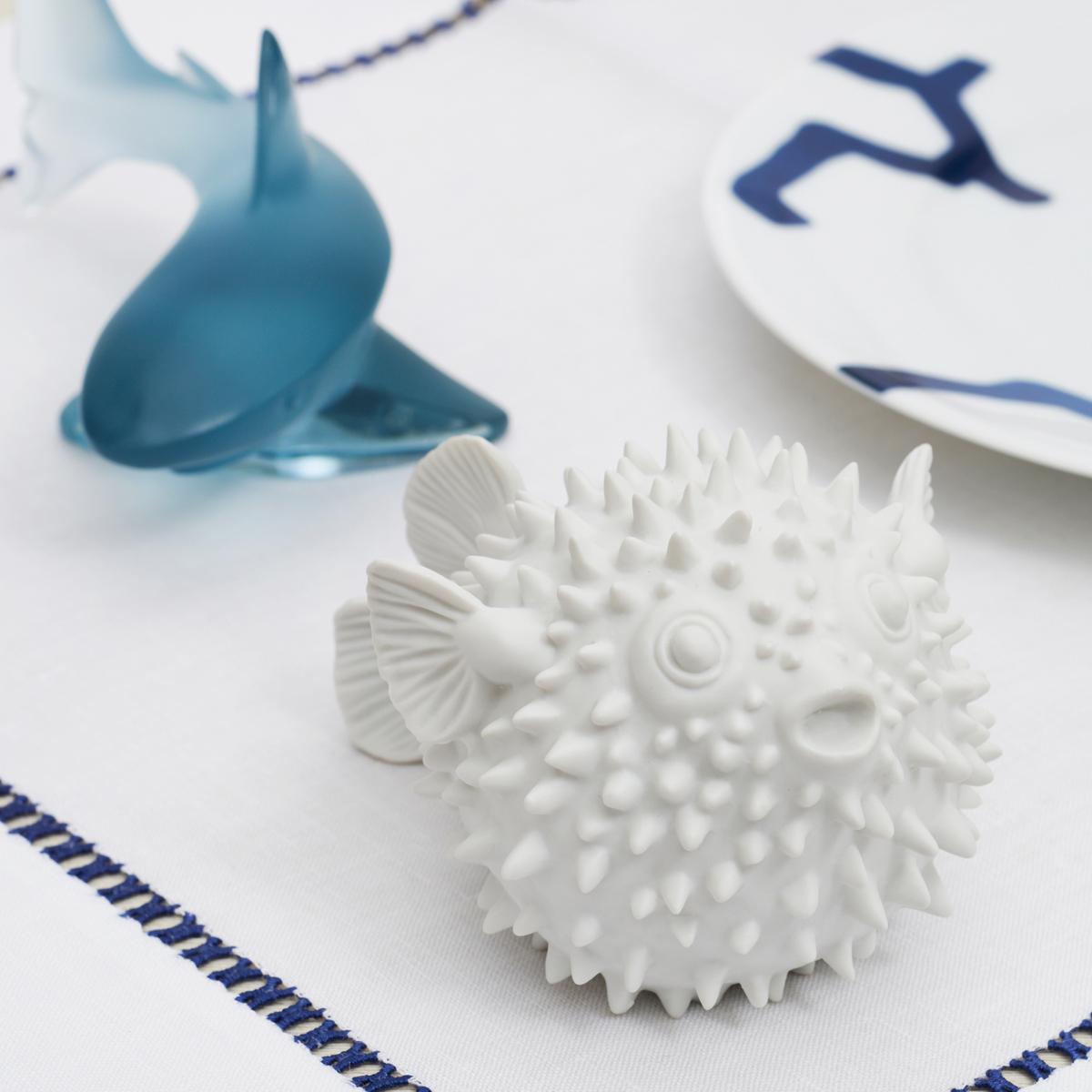 Kugelfische sind für ihre Bissigkeit gegenüber jagenden Tauchern berüchtigt. Dass dieser Igelfisch nach Ihnen schnappt, ist allerdings nicht zu befürchten. Lassen Sie sich entspannt von seinem aparten Anblick verführen, die in reiner Handarbeit liebevoll gestaltete Oberfläche dieser außergewöhnlichen Porzellanfigur mit den Fingern zu erkunden.