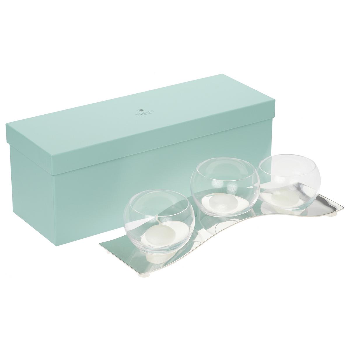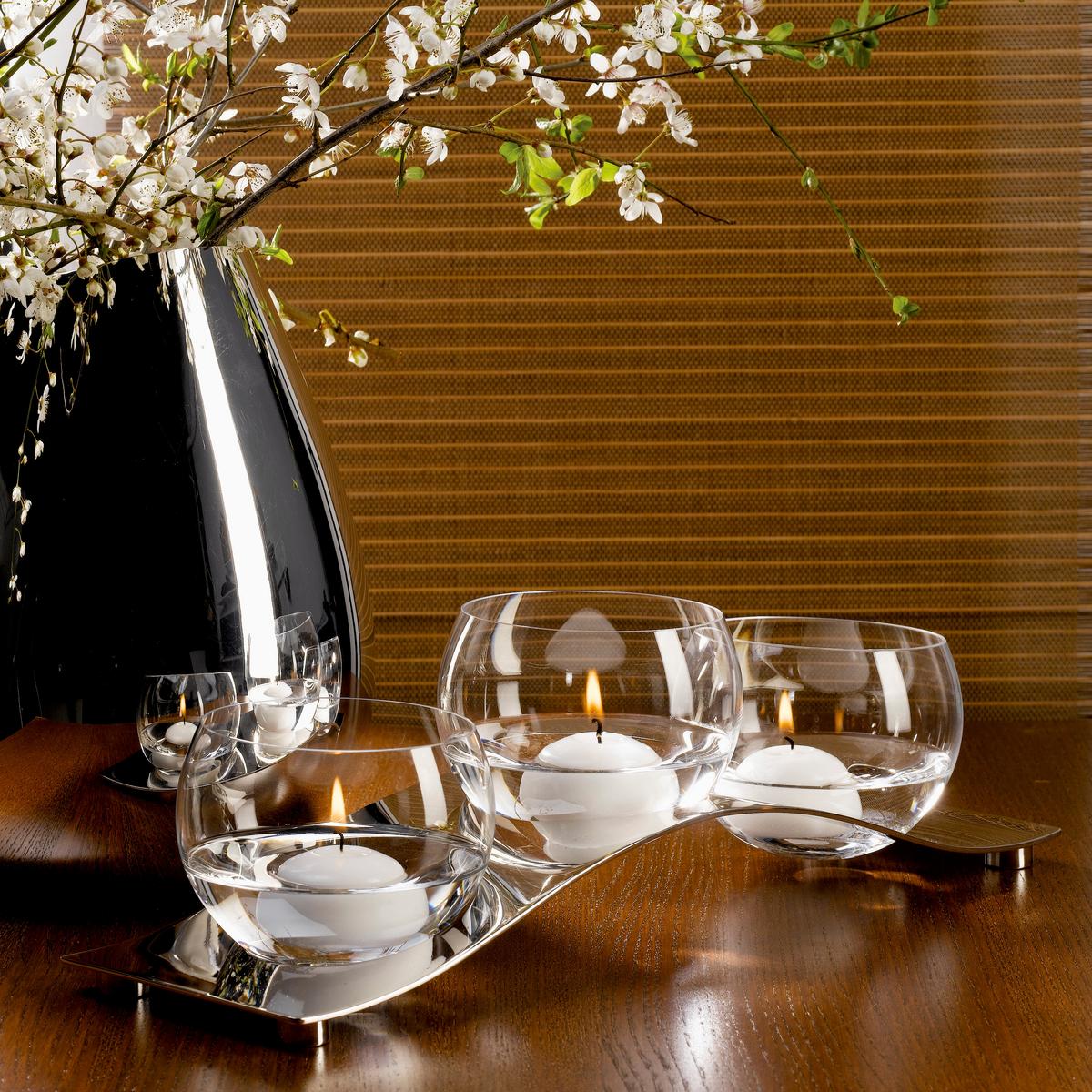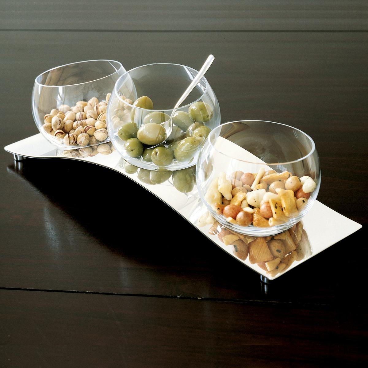 A multi-functional and extremely elegant table accessoire, this silverplated centrepiece by Ercuis is approximately 40 cm long. The glass dishes can be used for olives and other nibbles as well as for dips and sauces. And those who just enjoy contemplating the gentle wave on the coffee table can also use the dishes for floating candles. Further table accessories in the "Kallisté" range can be found below.