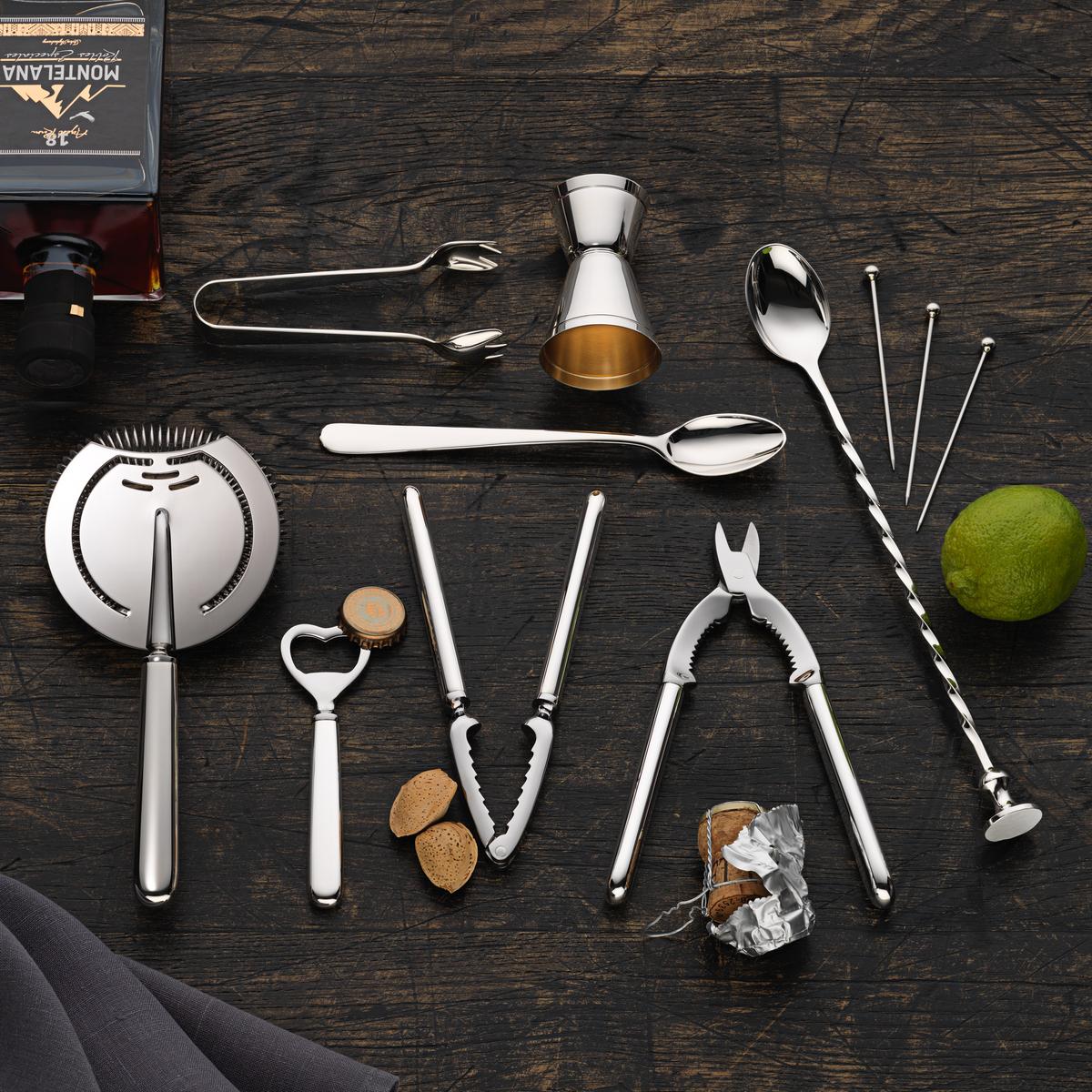 Cocktail strainer, Champagne tongs, ice tongs, bottle opener, longdrink spoon: 150g silver