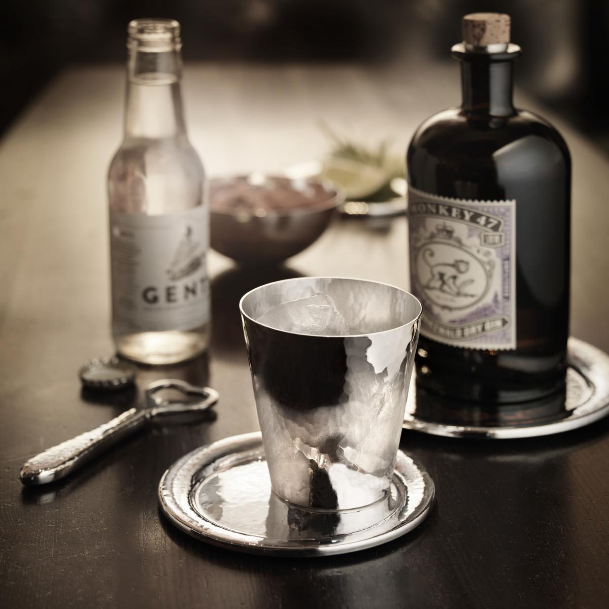 The bottle and glass coasters are the perfect match for the "Martelé" bar collection from Robbe & Berking.