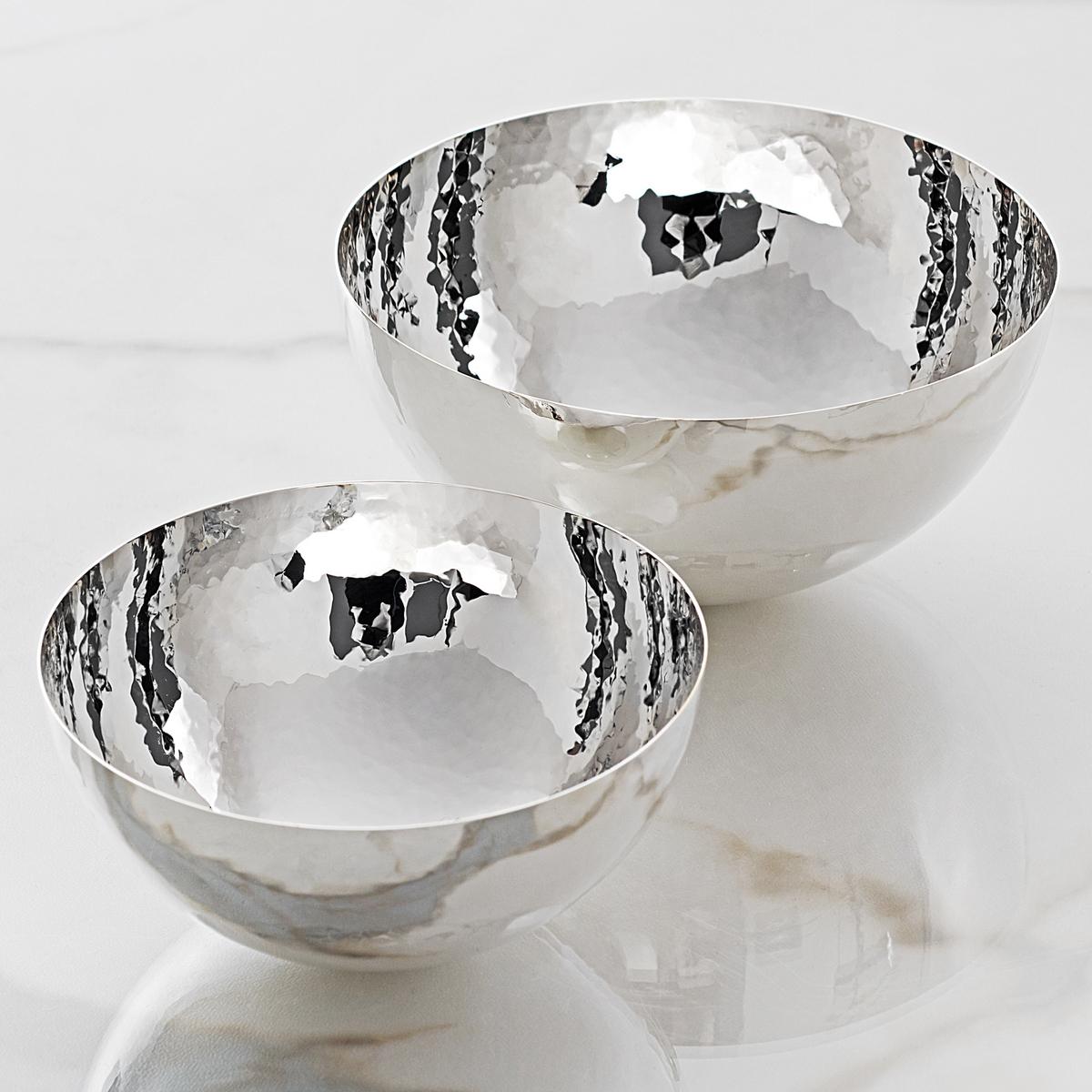 "Martelé" comes from the French verb marteler, "to hammer" and describes the fine hammering technique with which Robbe & Berking has created these enchanting bowls. The soft curves on the surface reflect the light in a hundred different ways. The paper-thin bowls are given the so-called "hammer finish". Silverplated (90g), they have a smooth rim, are ideal for small snacks and can be wonderfully combined with Robbe & Berking’s “Martelé” bar collection.