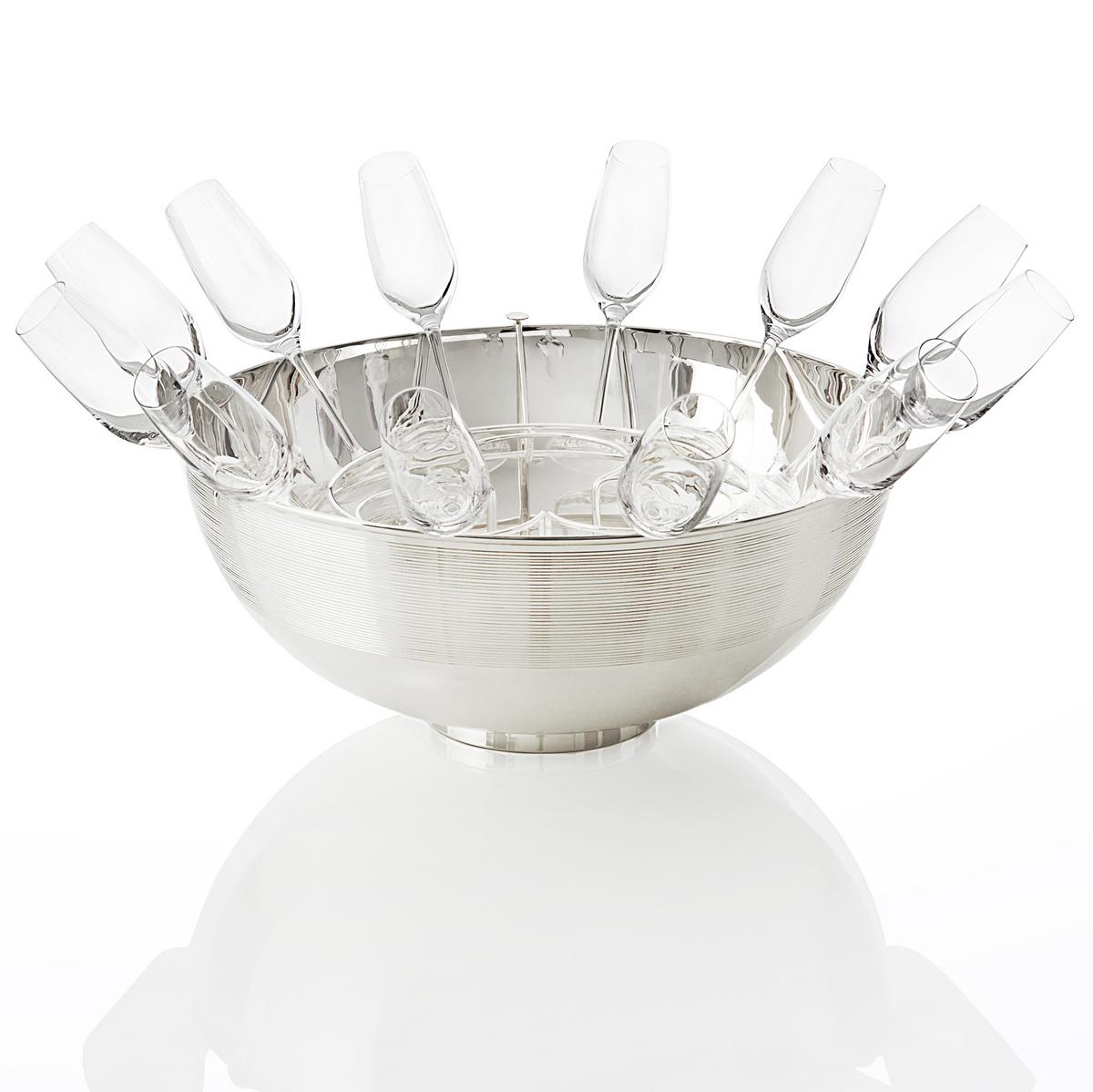 The silverplated "Transat" Champagne cooler from Ercuis comes with 12 flute glasses. The glasses can be placed in a removable ring and thus ice-cooled. There is also space in the middle of the ring for cooling three Champagne bottles.