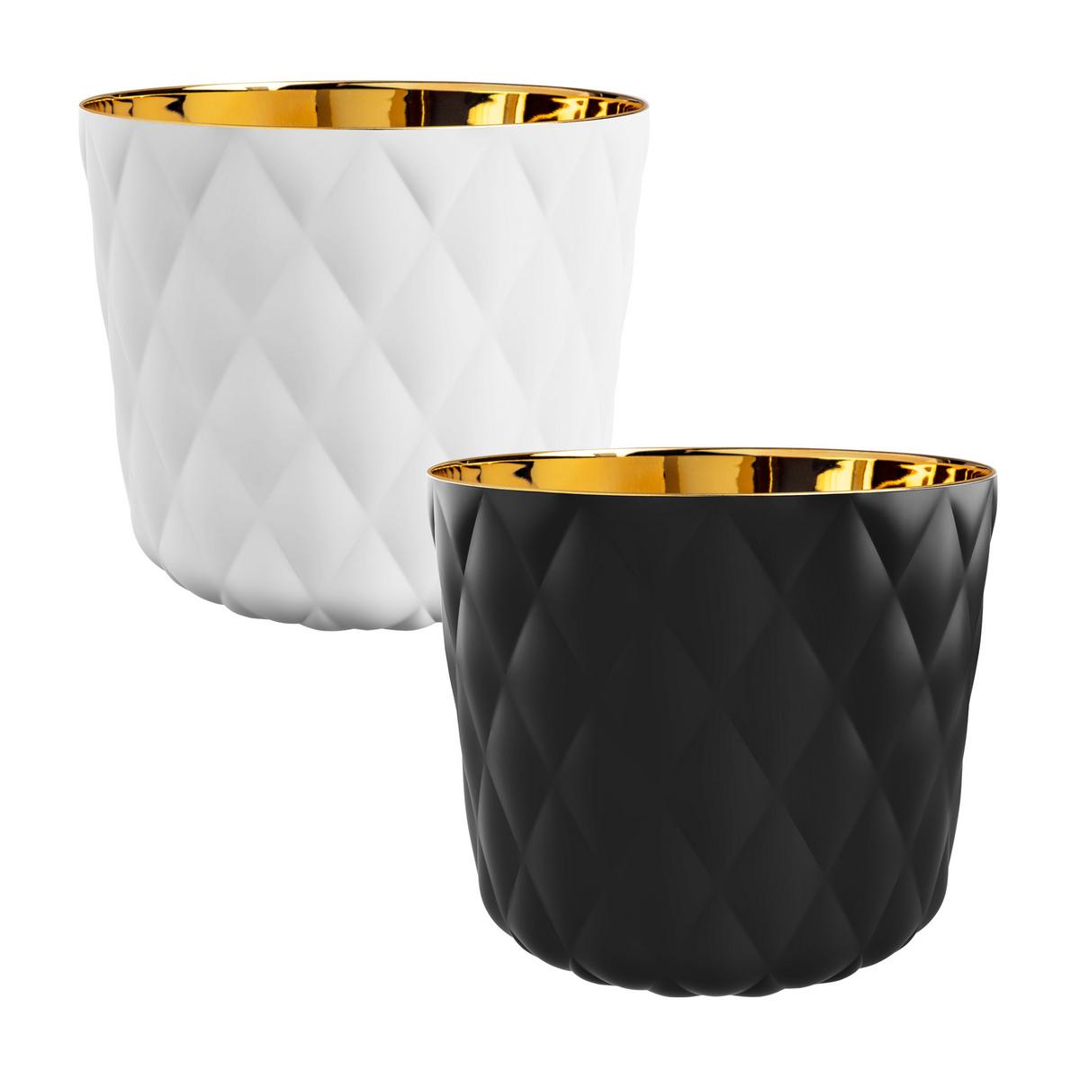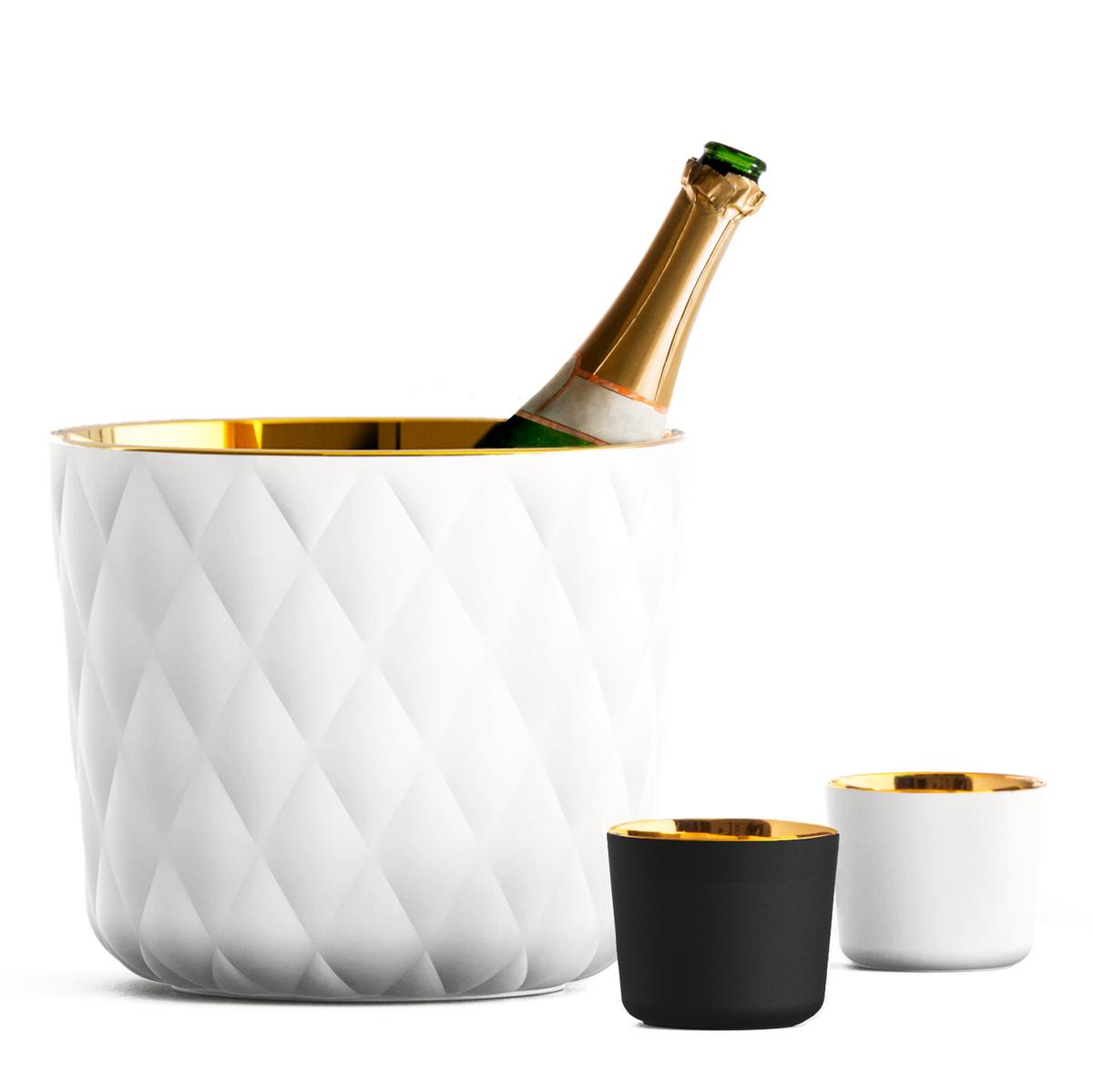 With its elegant diamond relief, the new handcrafted porcelain cooler "Cushion" from Sieger by Fuerstenberg is a perfect complement to the "Sip of Gold" Champagne tumblers.