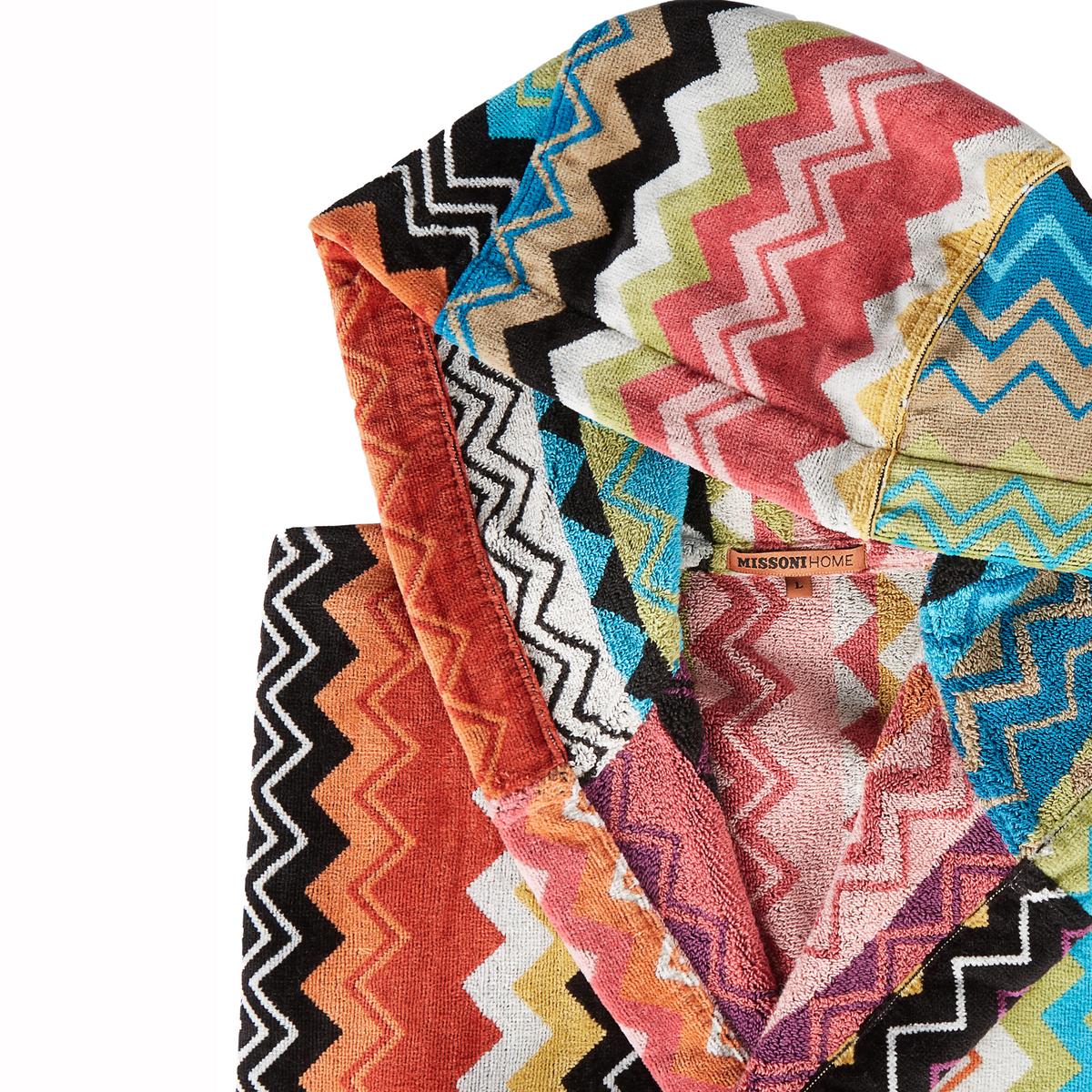 The "Giacomo" bathrobe displays the famously colourful zigzag pattern of the Italian luxury brand Missoni Home. The hooded "Giacomo" bathrobes multi-coloured (colour 100) are made of 100% cotton.