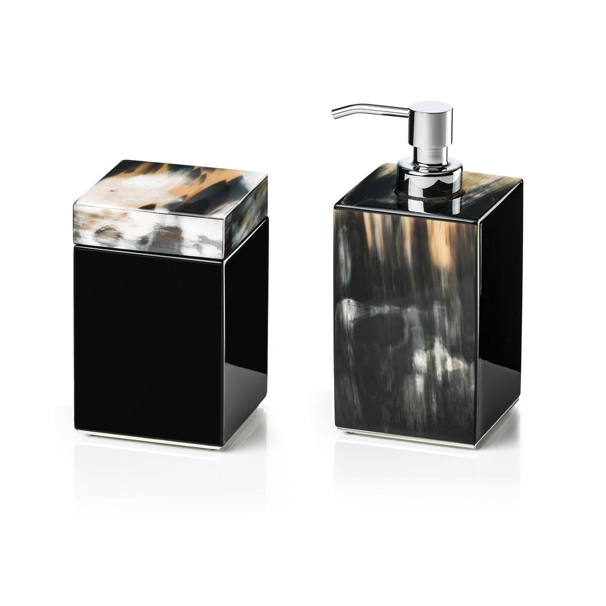 - a soap dispenser and a toothbrush holder of dark buffalo horn and chrome-plated brass with black lacquer