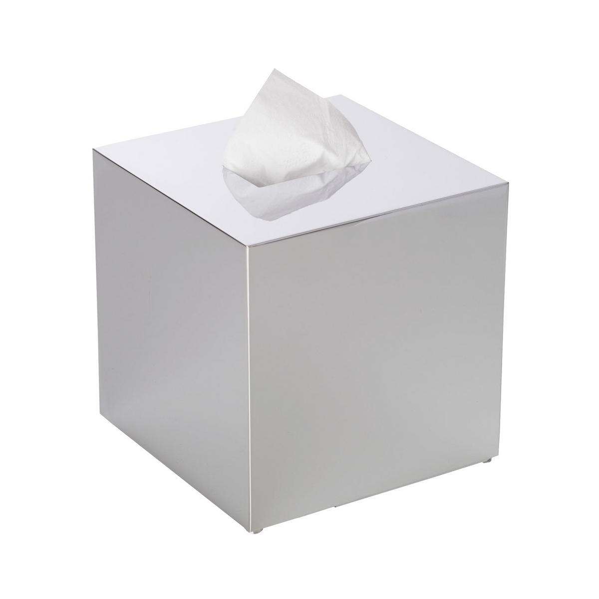 The pump head of the soap dispenser is also made of durable metal. An acrylic inner container provides ample space for liquid soaps. Since the tissue box holder does not have a bottom, it is simply put over the top of the tissue box. The rectangular tissue box is conceived both as free-standing model and for wall mounting.