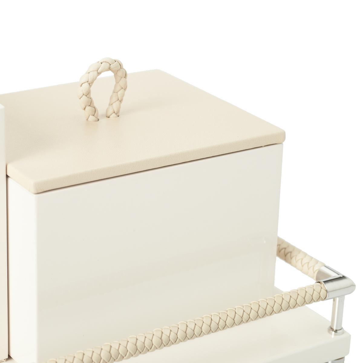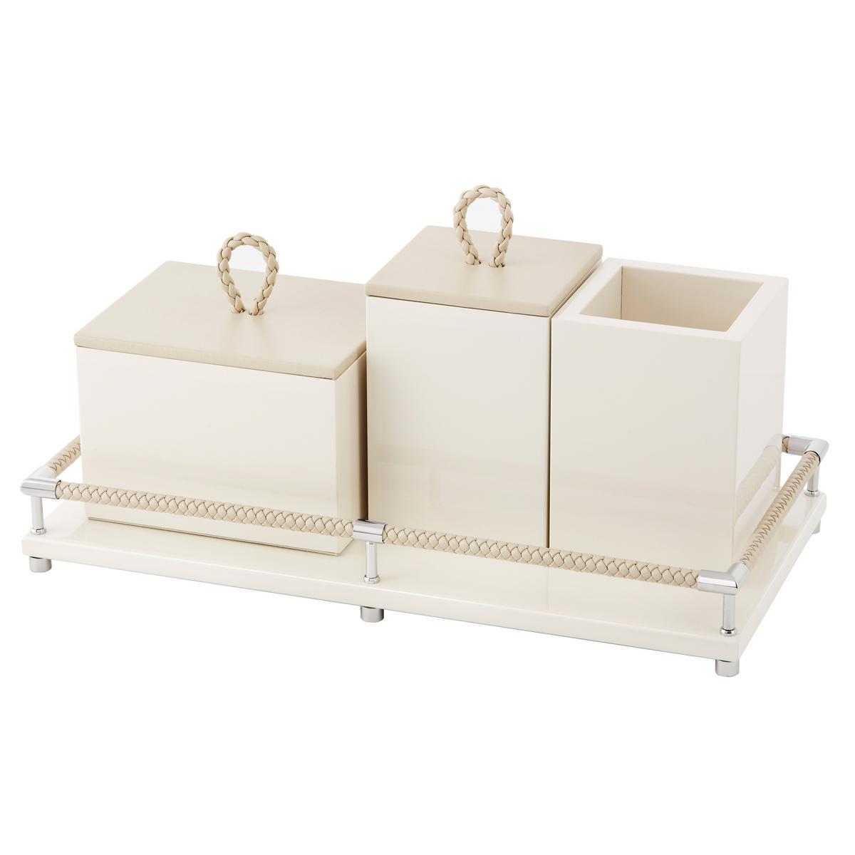 • 4-piece "Vanity" bathroom set: the three lacquered boxes are suitable for storing little bath utensils. Two of the boxes have lids made of leather. The lacquered tray with a leather railing and small chrome feet serves as a very elegant frame for the boxes.
