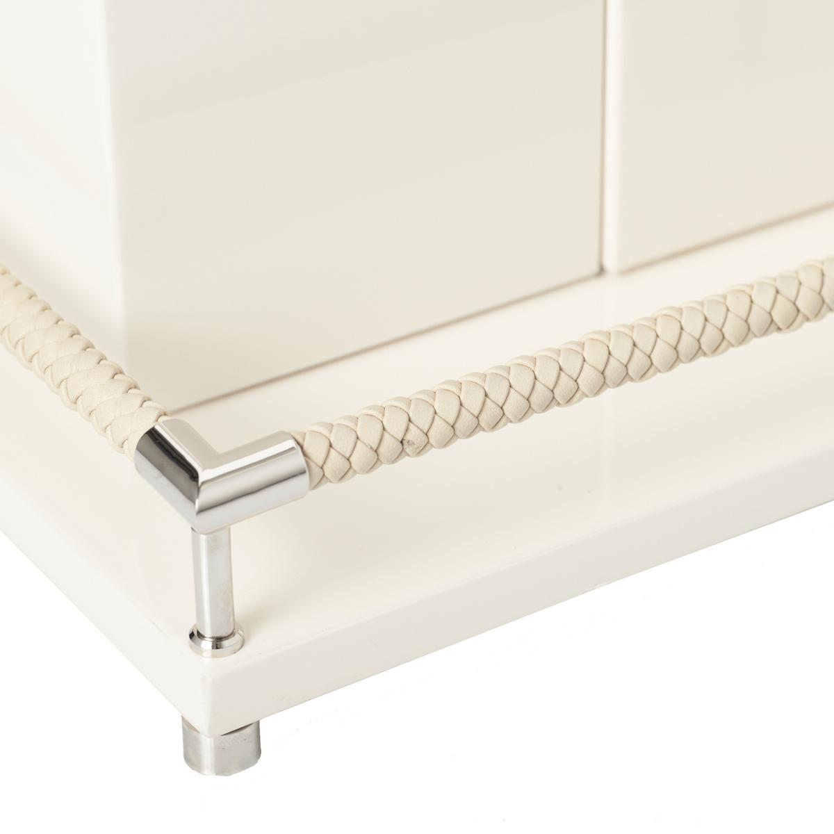 • Decorative "Vanity" tray with leather handles: coatings of lacquer applied by hand give the tray a refined elegance. The railing is made of fine, braided calf leather. Small chrome feet raise the tray slightly from the surface on which it is standing.