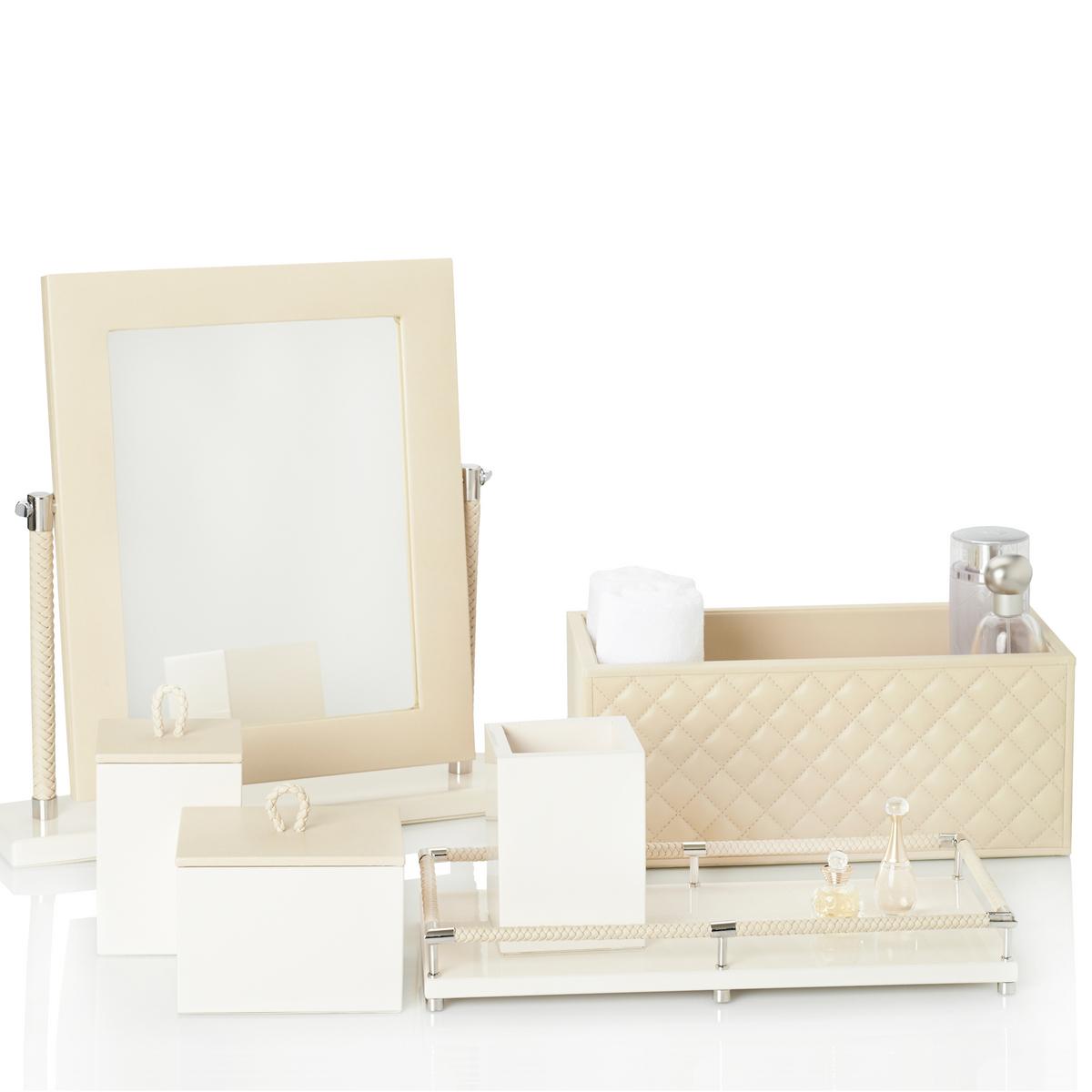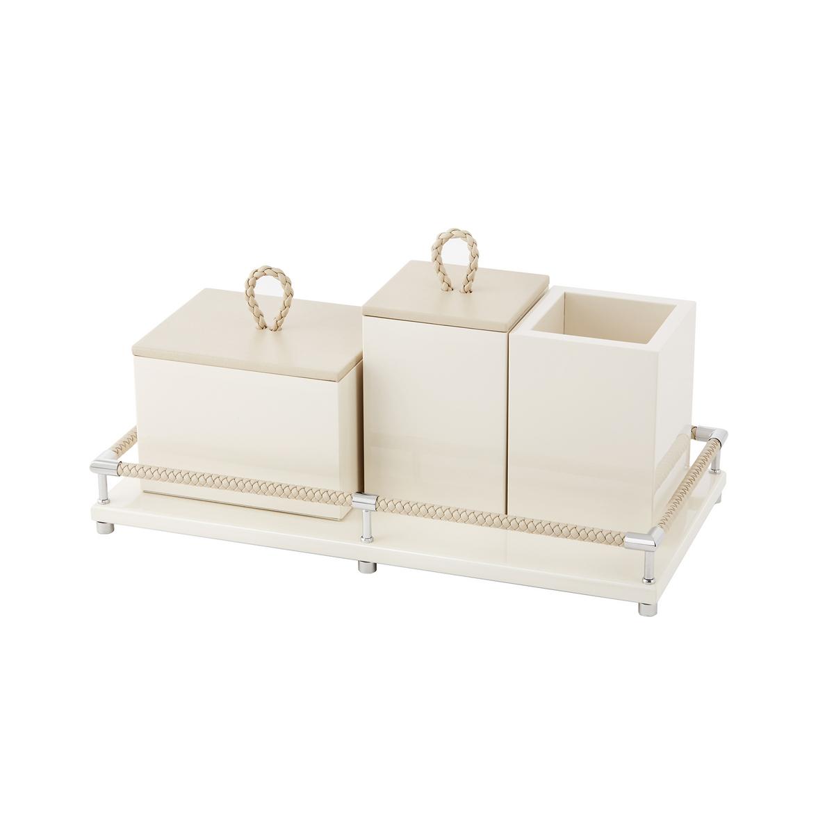 - 4-piece "Vanity" bathroom set: the three lacquered boxes are suitable for storing little bath utensils. Two of the boxes have lids made of leather. The lacquered tray with a leather railing and small chrome feet serves as a very elegant frame for the boxes.