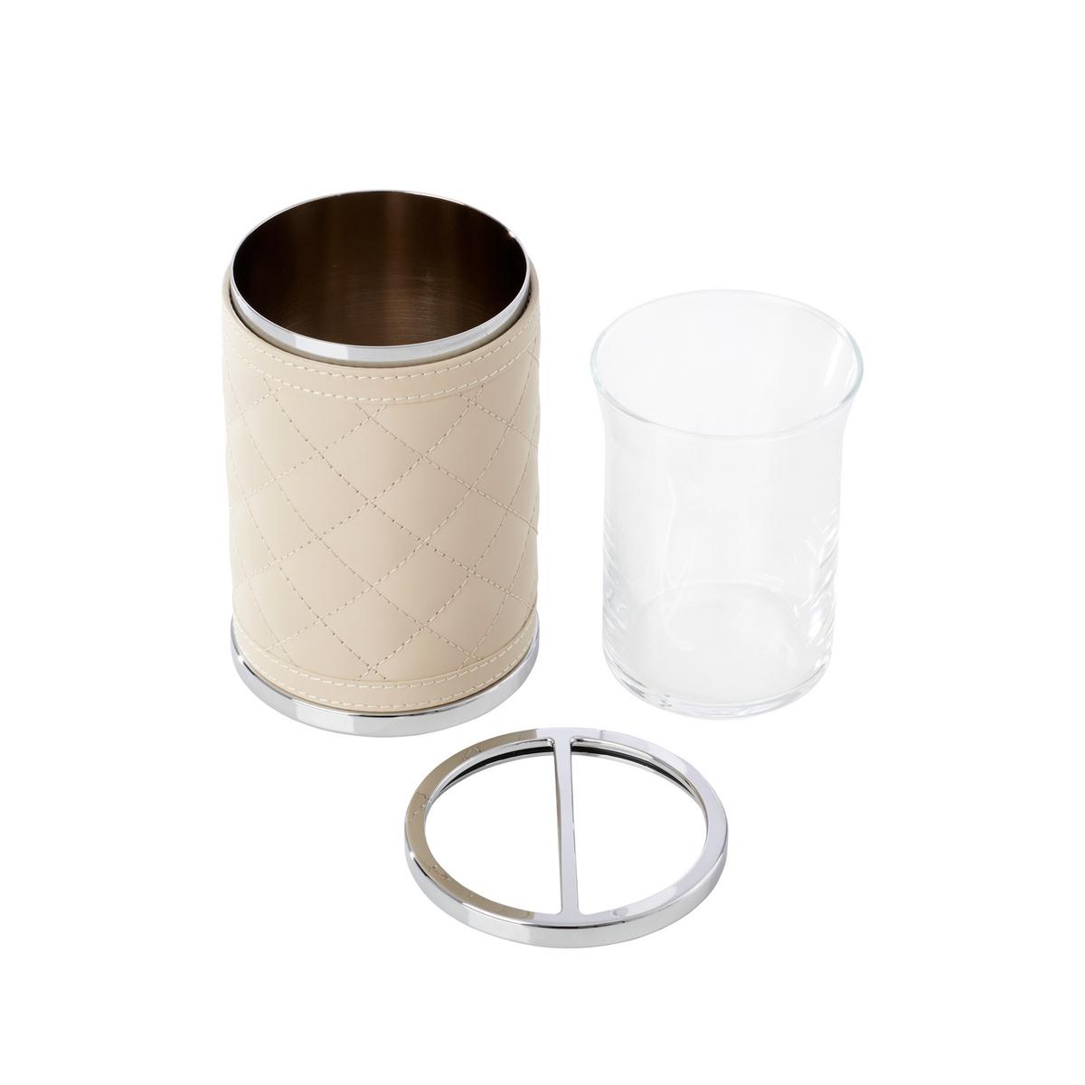 - Made of the finest Italian calf leather and chrome-plated brass, the soap dispenser, toothbrush holder, leather box and boxes are not only necessary utensils, but also optical highlights. The toothbrush holder has a removable glass inset.