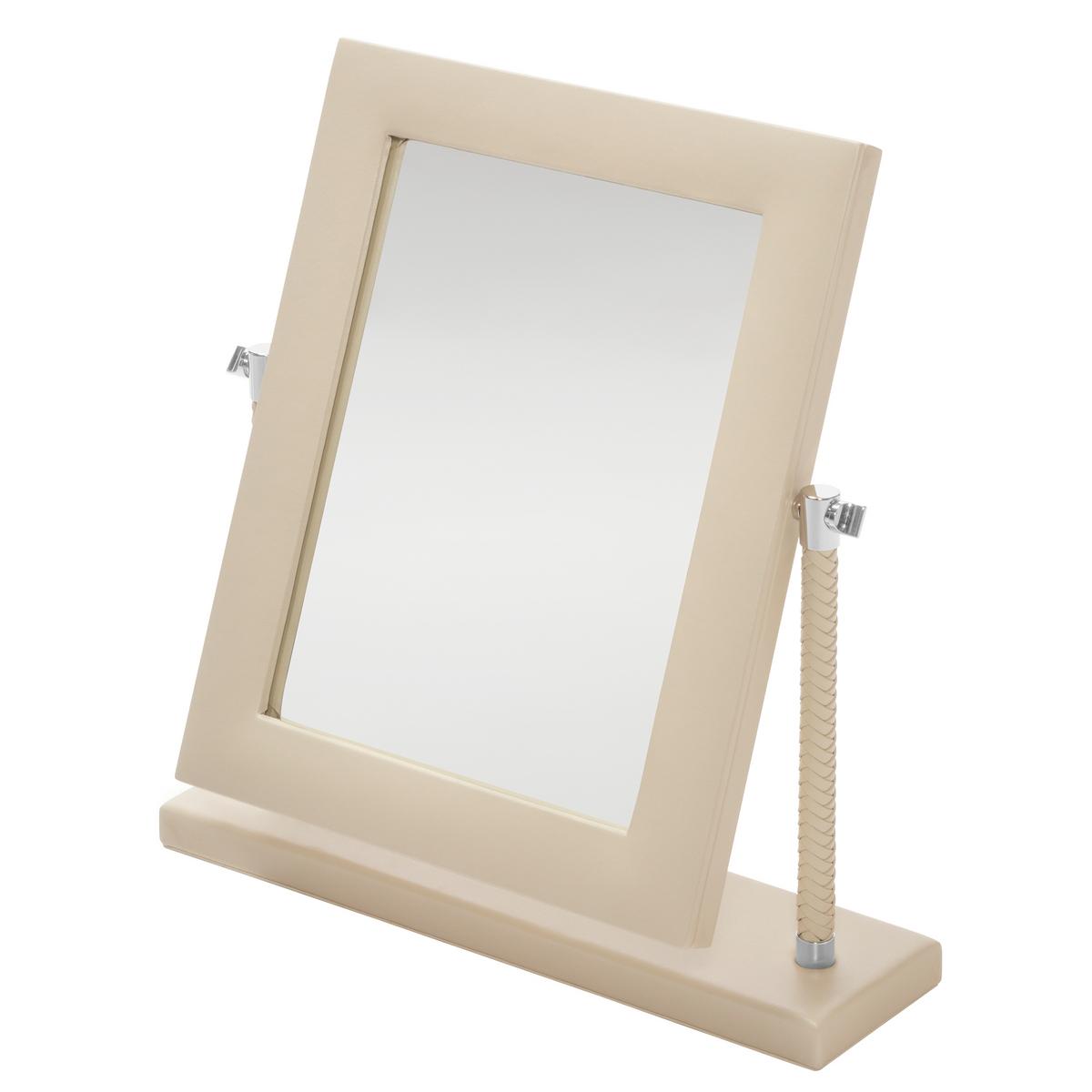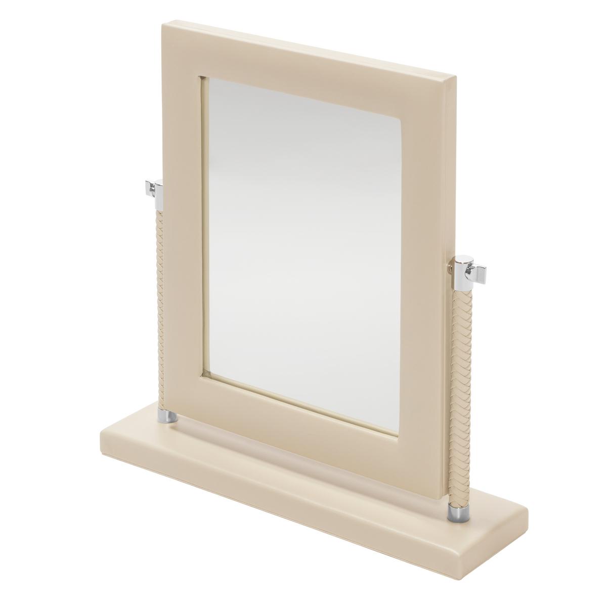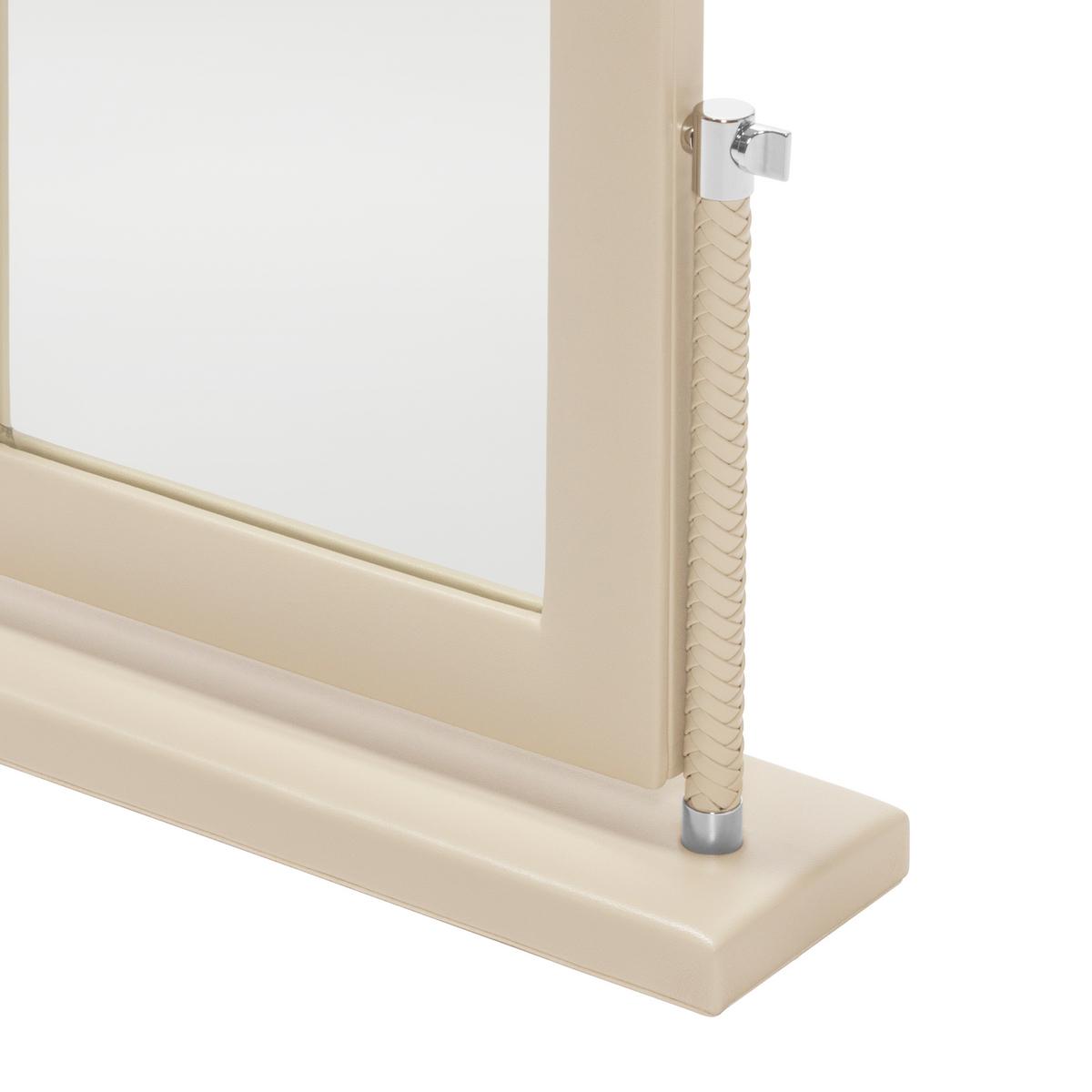 • Leather "Vanity" mirror: the foot of the mirror is lacquered whereas the frame and the rear of the frame are made of leather. The position of the mirror can be adjusted precisely using the chrome rings on the sides. No magnifying mirror.