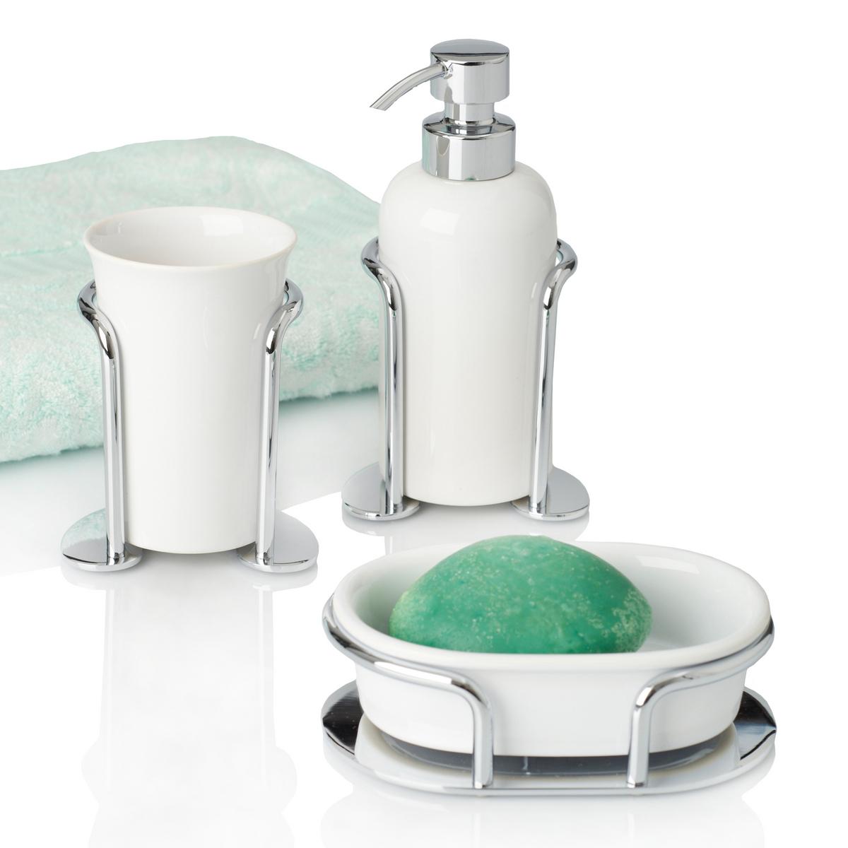 Each piece is first highly polished before three coats of chrome are applied. The cups and dishes made of white ceramic are easy to remove and to clean.