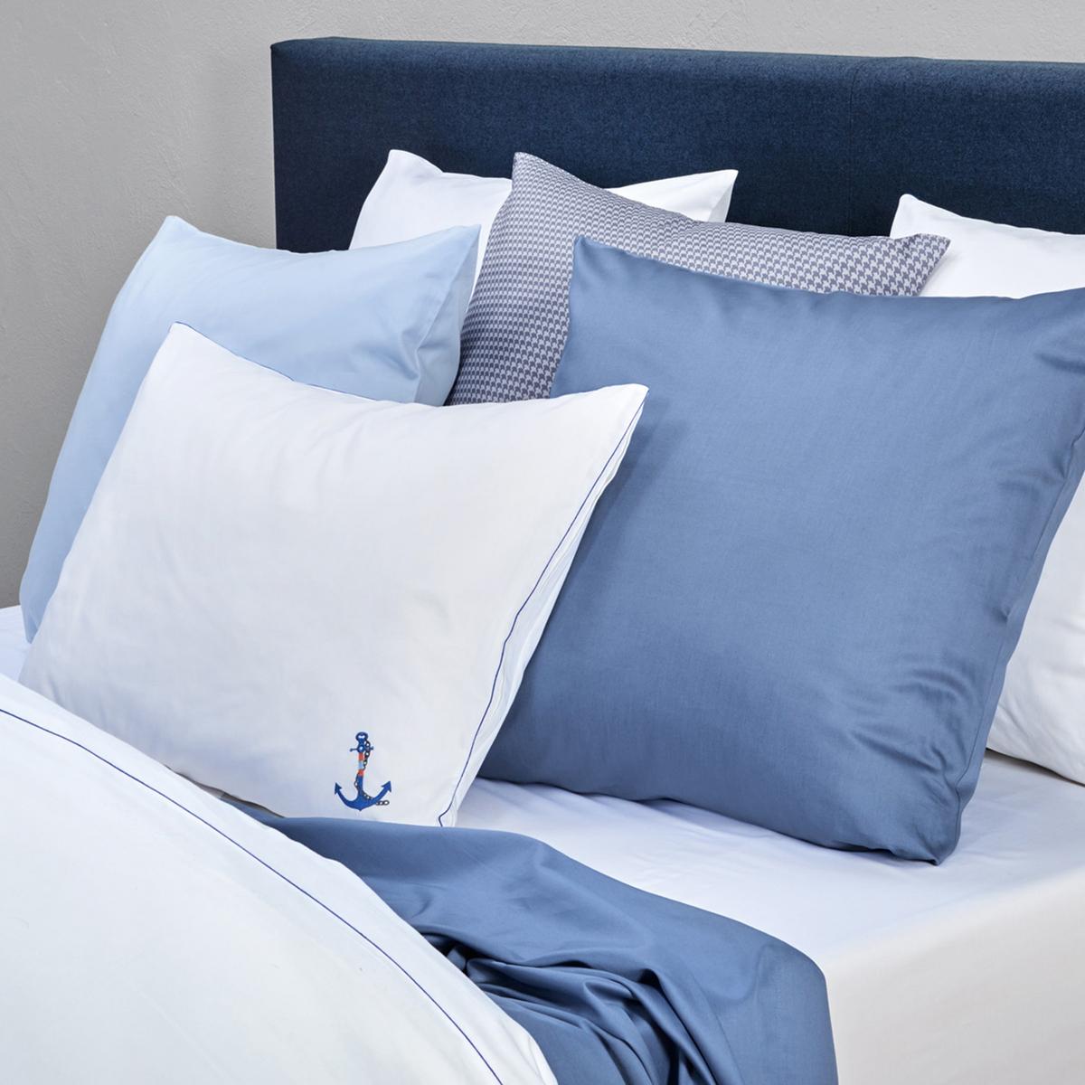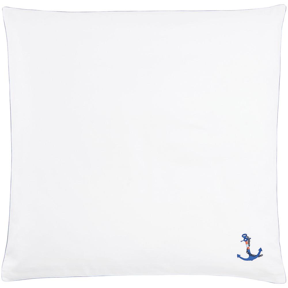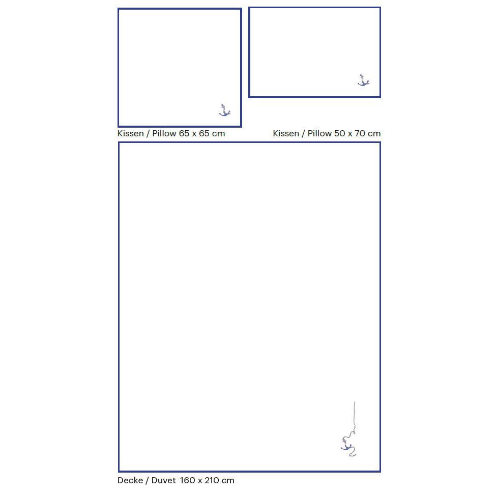 The "Ahoi" bed linen by Christian Fischbacher creates an airy, light holiday mood. The white bed linen is decorated with a small anchor in the lower right corner of the pillow case and a slightly larger motif on the duvet cover. The multicoloured, hand-stiched embroidery is accompanied by a fine edge (cord) in matching maritime blue. The edge frames the whole pillow case and the duvet cover.