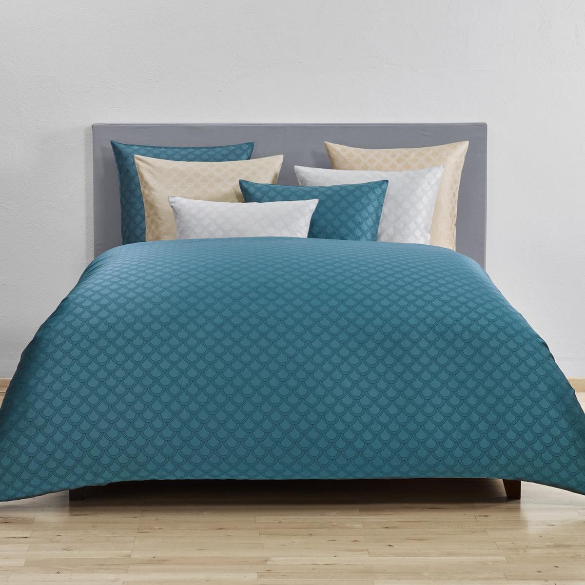 The design for the "Belle Epoque" bed linen comes from the design studio of Christian Fischbacher in Switzerland. A very high percentage of cotton sateen in the surface of the material gives the bed linen a very smooth and elegant feel. "Belle Epoque" by Christian Fischbacher is available in three colours: petrol, a metallic, glossy blue-green colour; light grey; and sand - each with an option to order the individual item in a lighter or darker version (Belle Epoque and Belle Epoque Verso).