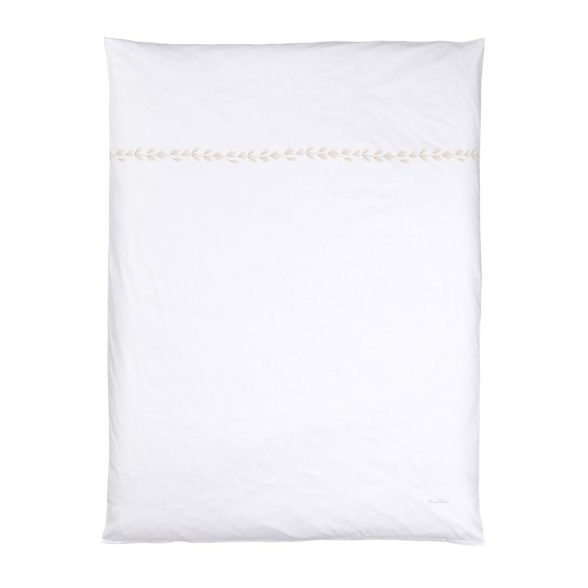The delicate embellishments on the "Foglia" bed linen by Christian Fischbacher are a homage to classic embroidery and reminiscent of feathers. This ornamentation is embroidered by hand on the cotton satin in an elaborate process. The two-tone rayon yarn in shades of gold and silver looks both exceptionally light and three-dimensional on the Swiss-Cotton Christian Fischbacher satin. The graceful shapes subtly frame the pillowcase and wind their way across the duvet cover on the "Foglia" bed linen.