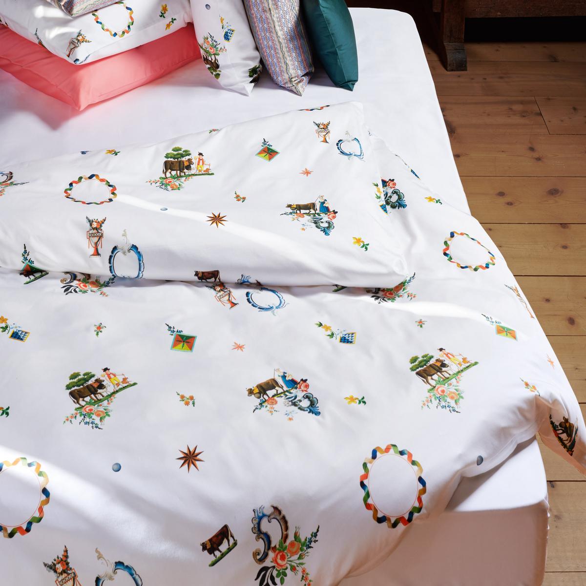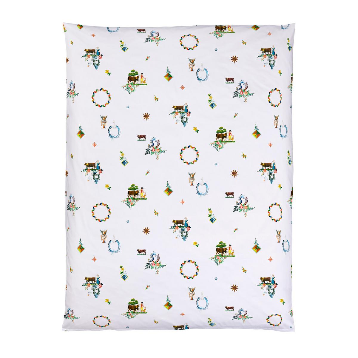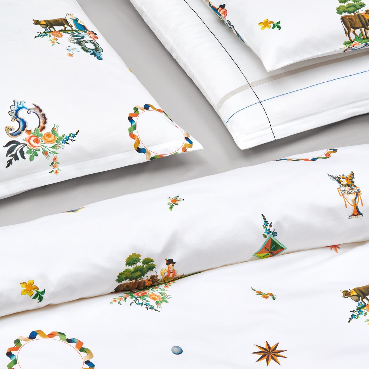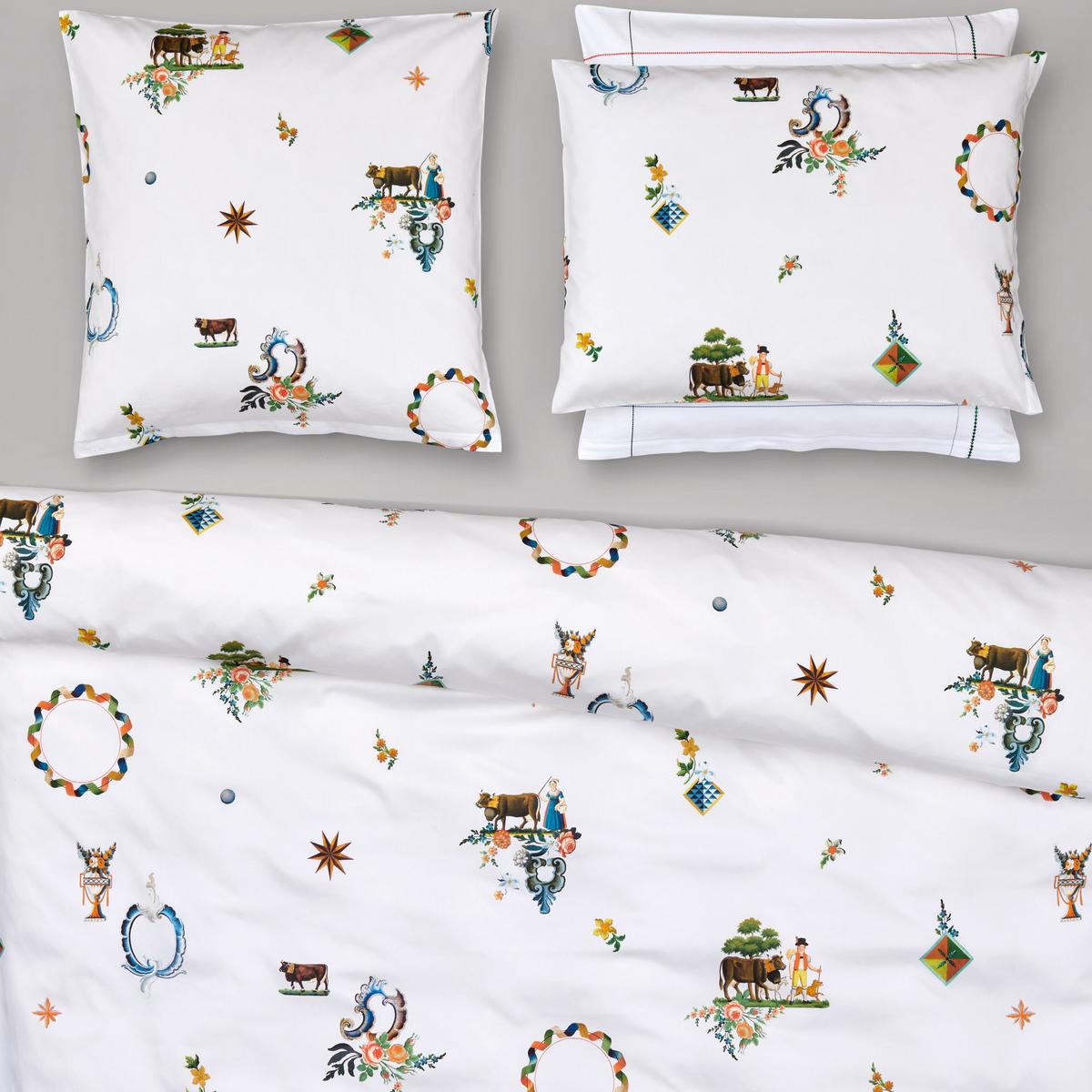 The "Säntis" design by Christian Fischbacher features a playful take on Swiss traditions on a delicate pure cotton satin bed linen. The modern design featuring plenty of white space breathes new life and light into motifs from old decorative paintings depicting scenes of rural life. The Fischbacher team of designers visited a local museum and digitised and rearranged some of the paintings in its archive to create this charming bed linen.