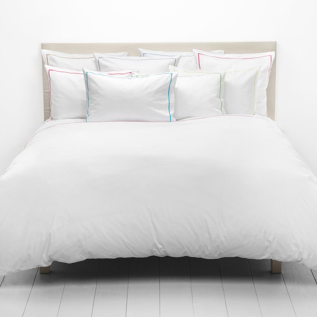 When you look at the "Satin Premium" bed linen from Christian Fischbacher, your attention is immediately captured by its decorative "frame". This is embroidered with the greatest care on the pillow cases and duvet covers. The embroidered lines are available in a wide selection of colours that can be combined very well with other colours in the series. What is more, the "Satin Premium" bed linen by Christian Fischbacher has a very finely sewn external rim in the same colour as the embroidery. The fine cotton sateen feels beautifully soft and has a tasteful white shimmer.
