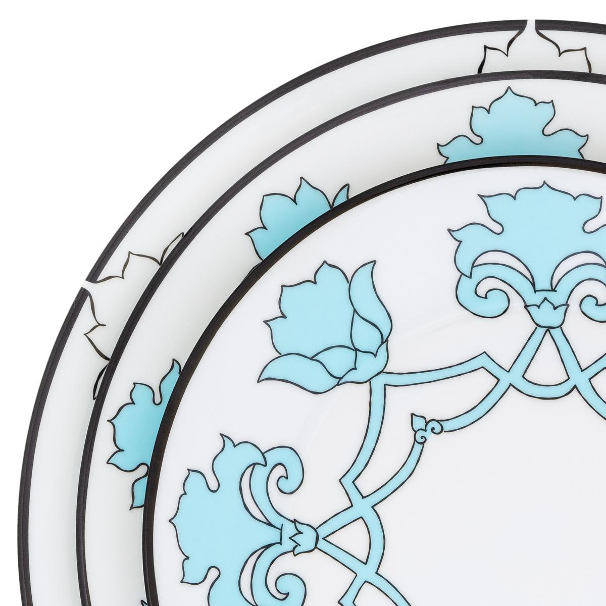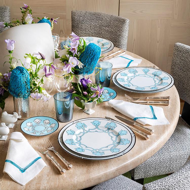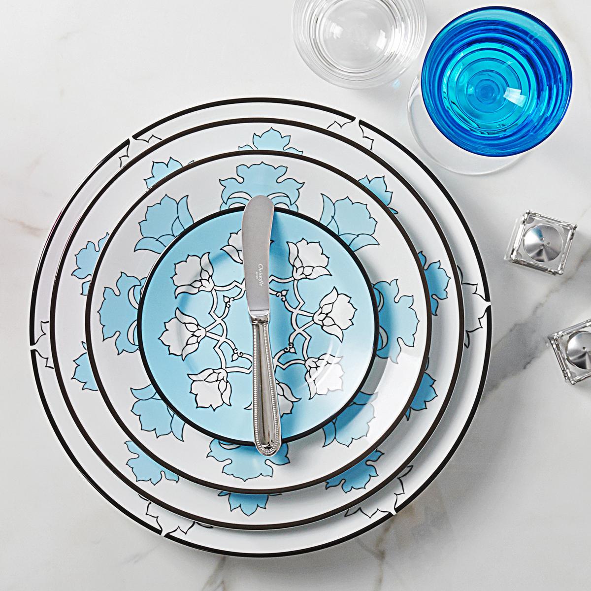 An elegant celebration of India. The "Jaipur Aqua" dinner service by Alberto Pinto is inspired by Indian ornaments and motifs. The white Limoges porcelain plates are printed with chromolithographs of stylised light blue vines and flowers. The décor is reminiscent of traditional depictions of the lotus flower, the symbol of renewal, purity, harmony and open-heartedness. A contrasting black border frames the symmetrical floral print and emphasises the abstract imagery of the design. For a unique table setting, compose your personal colour harmony with "Jaipur Aqua" and the other colours of the "Jaipur" collection and stack them like a mandala.