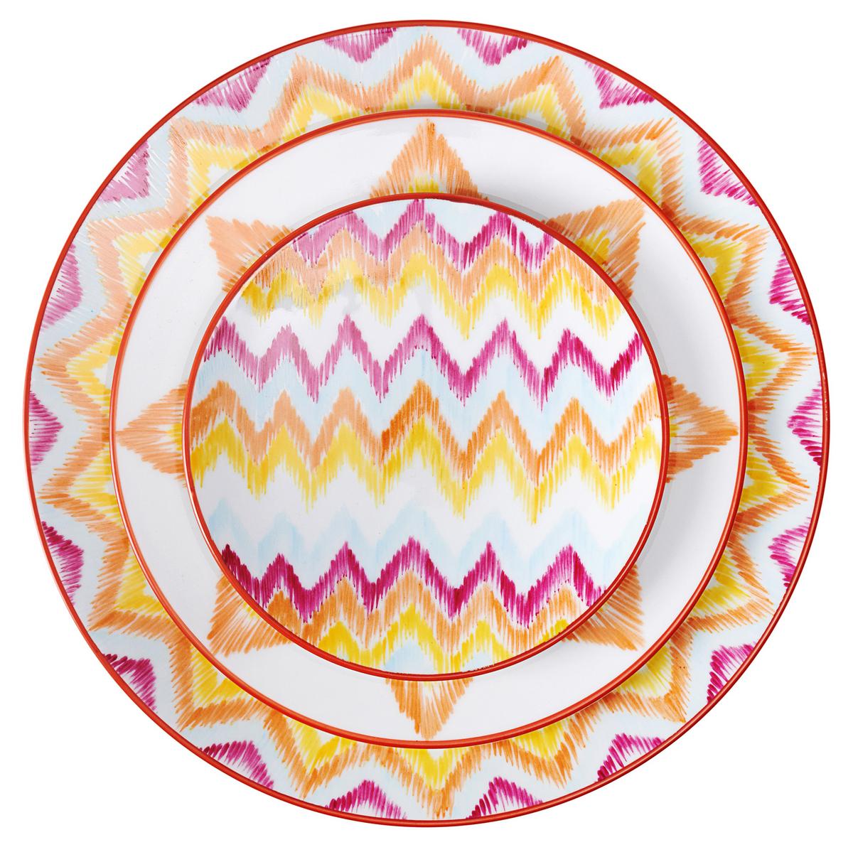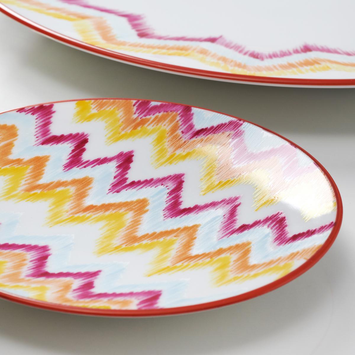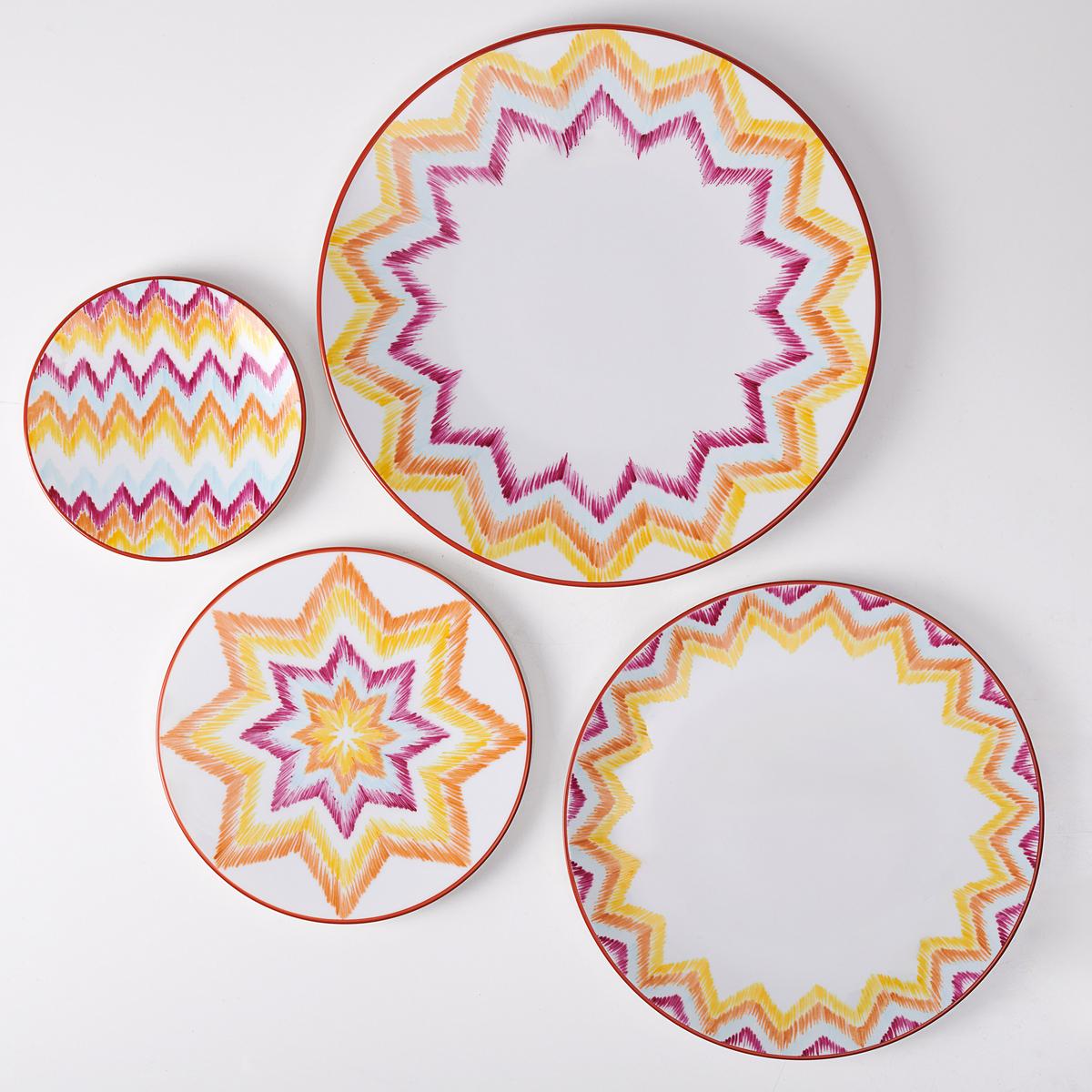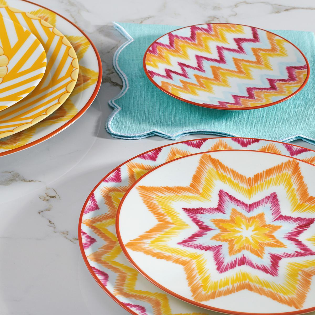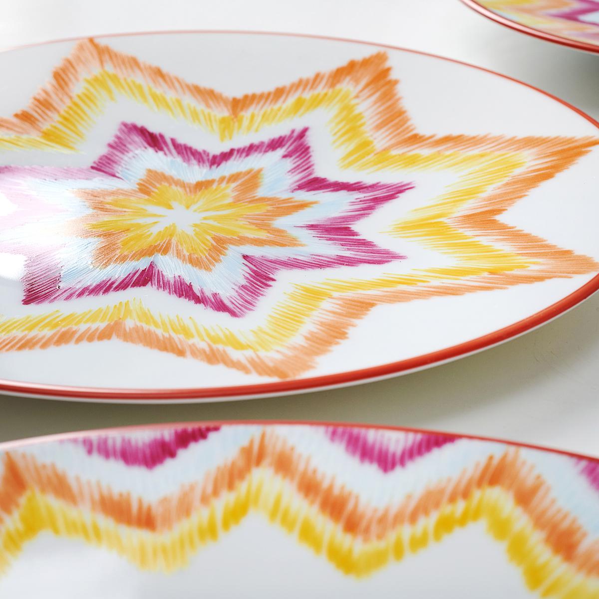 Fierce patterns for free spirits. The "Gaucho" tableware collection by Arcanie brings the rugged elegance of South American textiles to fine Limoges porcelain. The décors are inspired by the vibrant ponchos of the gauchos, the legendary riders of the South American pampas who remain symbols of freedom, authenticity and independence. Across plates and cups run hand-painted chevron and star motifs, created from many individually placed brushstrokes. In warm shades of yellow, orange, violet and red, a rhythmic interplay of lines and forms unfolds, conveying both energy and elegance while evoking the lively texture of woven fabrics. Additional items such as pots, mugs, platters and bowls are available on request.
