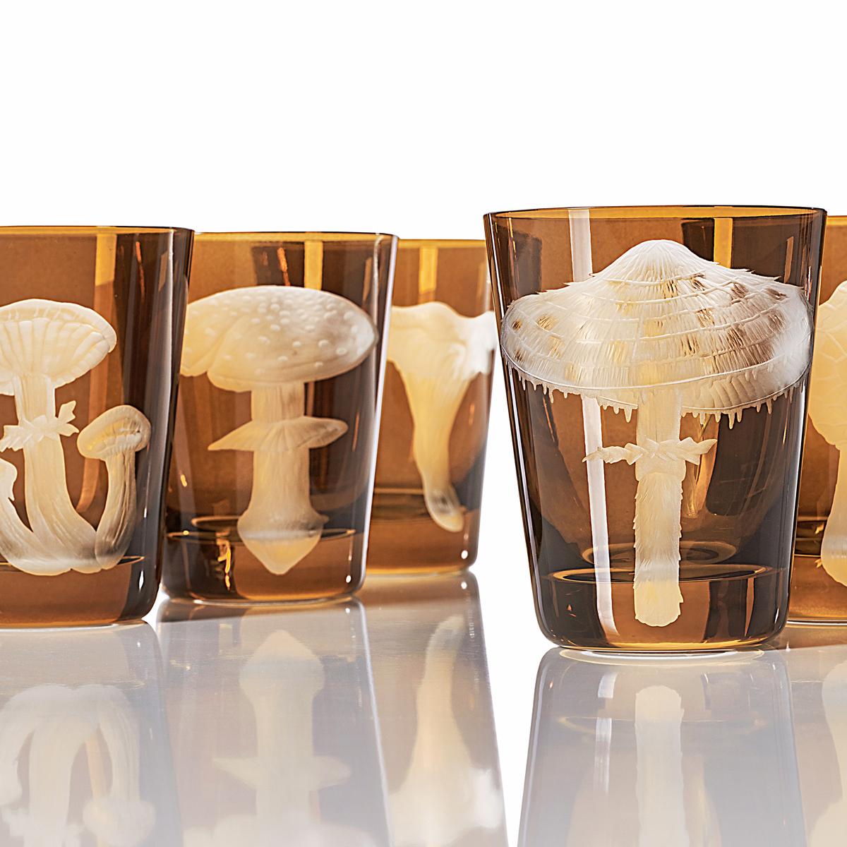 The "Mushrooms" small tumblers by Artel celebrate the diversity and beauty of these fascinating fungi with six unique motifs. The designs are inspired by classic botanical drawings from the 19th century. Each mushroom is intricately hand-engraved into the glass by true artists of their craft.