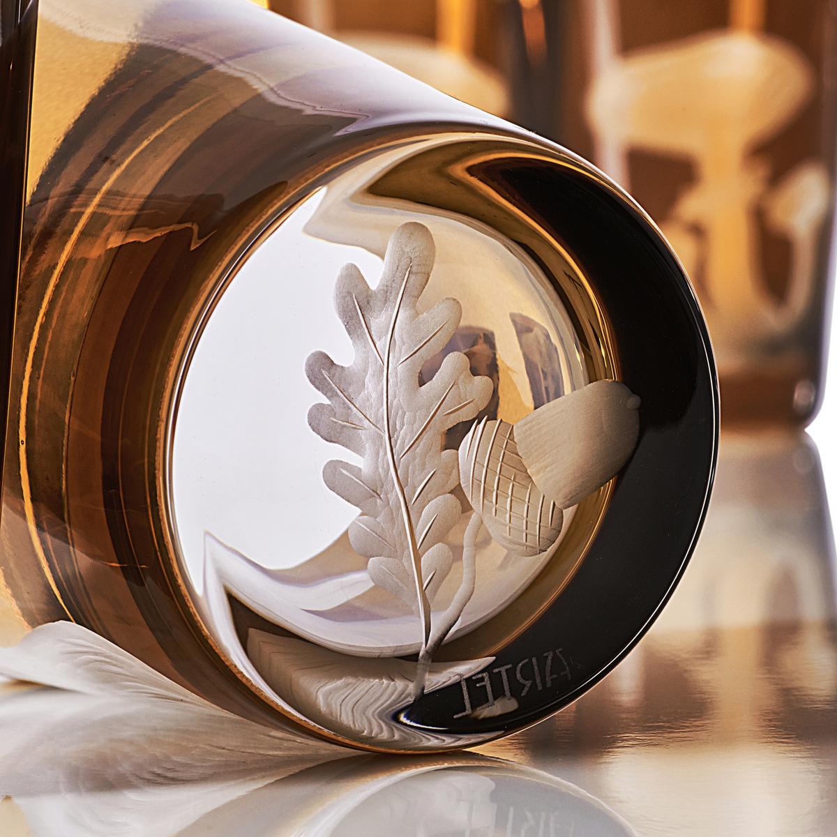 Each glass is mouth blown and hand decorated with the artistic cut by Artel glass engravers in Prague. The fine air bubbles trapped in the glass are proof of the manual production and underline the individual character of the crystal glasses. The "Mushrooms" small tumblers are also available in further colours on request. Other glass shapes can also be selected with this pattern. We are happy to provide you with assistance.