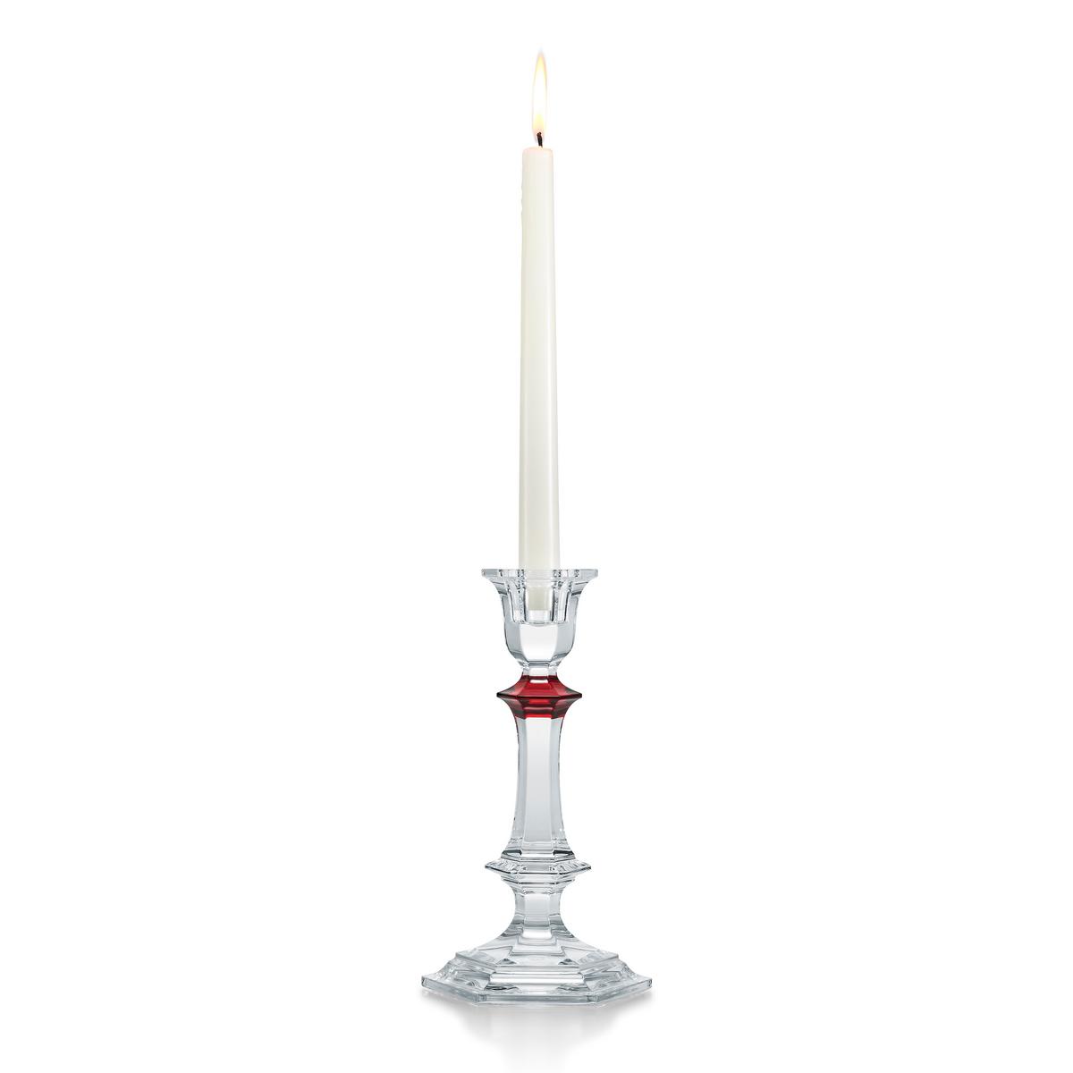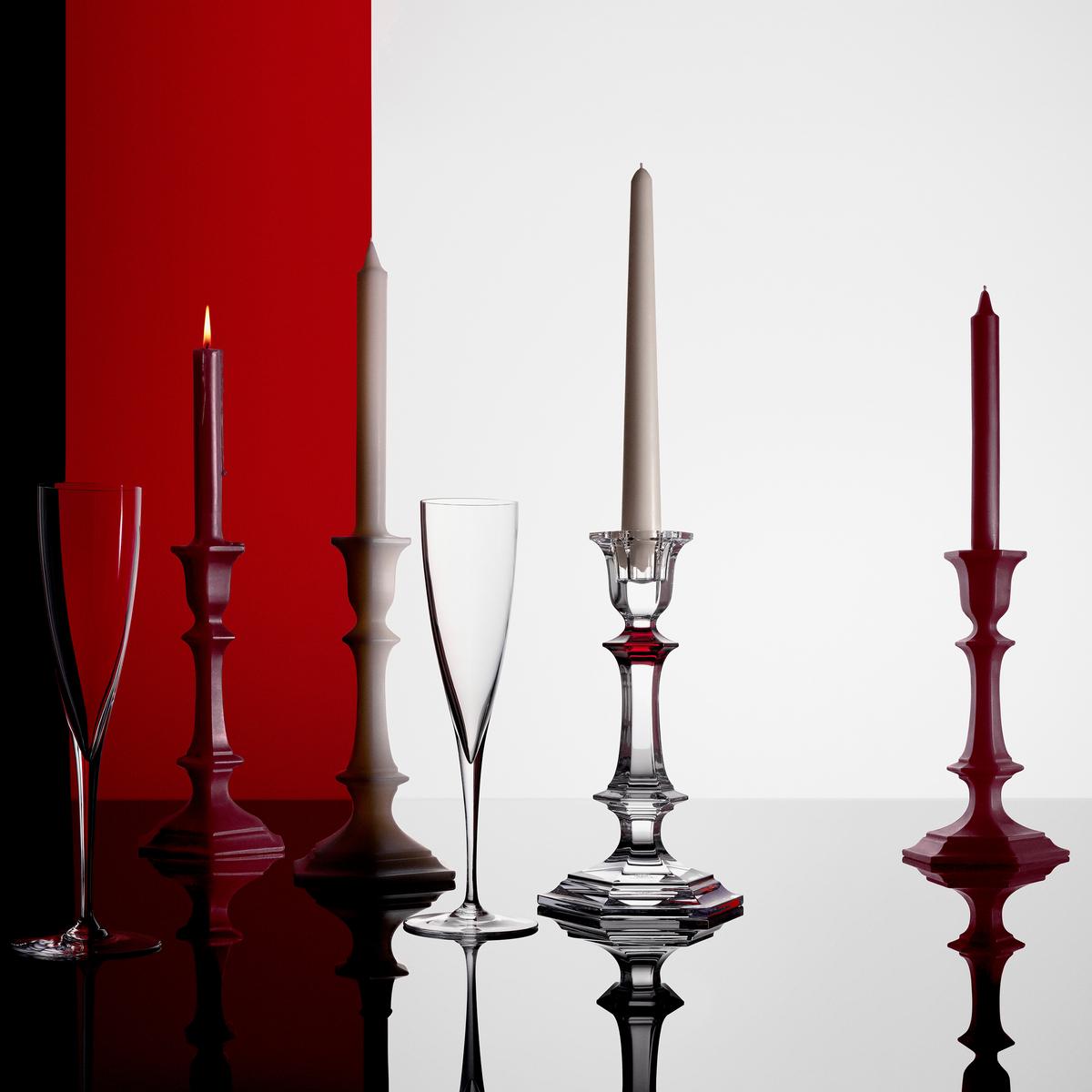 A majestic light with a touch of passion: The "Harcourt" candlestick with red knob from Baccarat unites the iconic silhouette of the house’s oldest crystal collection with the renowned Baccarat red. The radiant, ruby-red element at its center sets a noble accent, highlighting the architectural rigor of the form with a modern, sensual contrast.