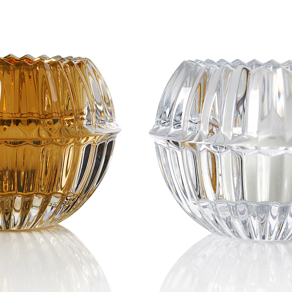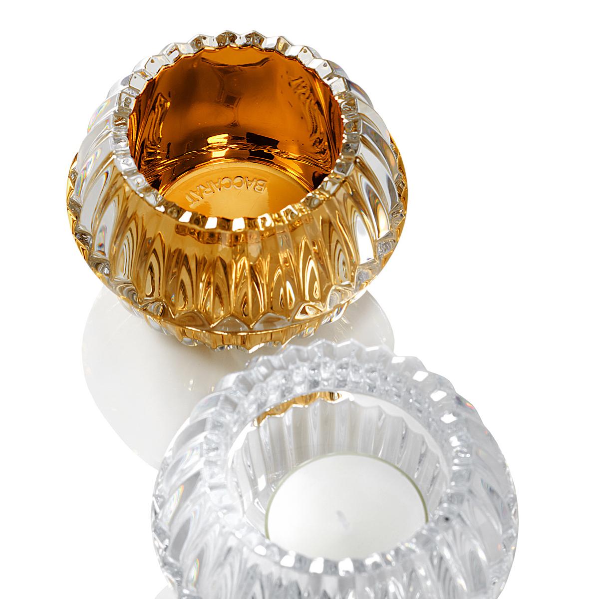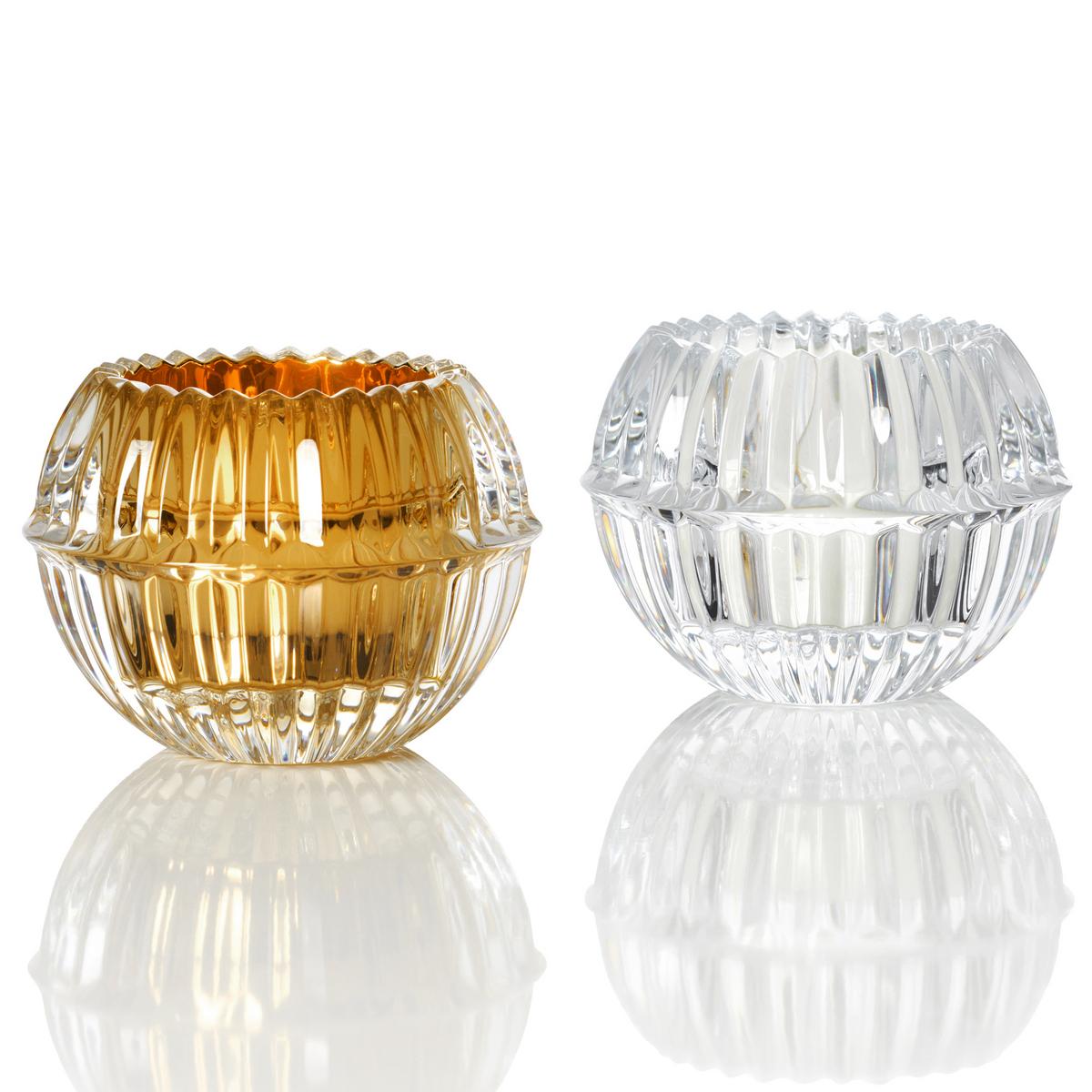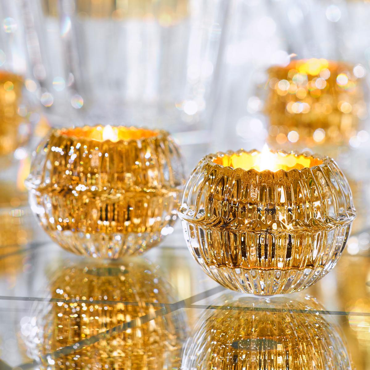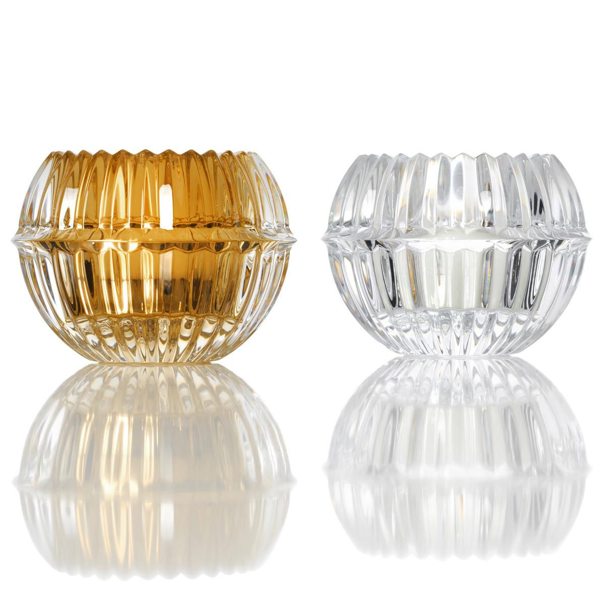 In gold, the 20 carat gold-plated interior shimmers through the countless facets of the polished and ruffled edges of the spherical votive. The fiery flickering of a candle brings the golden reflections to life and makes them dance through the brilliant crystal glass. An impressive demonstration of the fine craftsmanship of Baccarat, which enhances the finest tables with a soft glamour.
