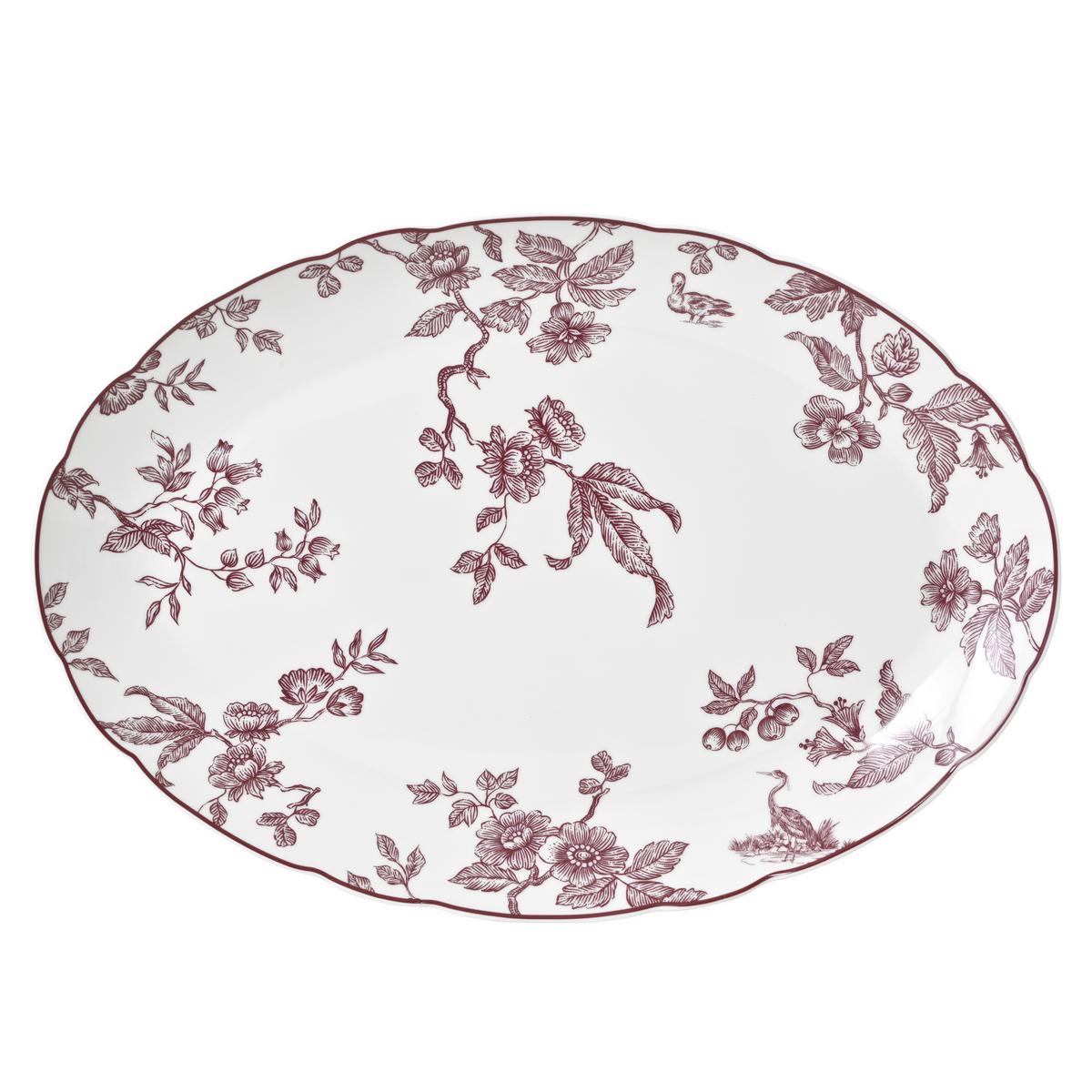 The warm plum hue – faithful to the traditional palette of Toile de Jouy fabrics – brings depth, sophistication and a contemporary richness to the décor. Graceful nature studies featuring chickadees, herons, ducks and pheasants unfold among blooming branches and lush foliage, evoking the abundance and generosity of nature. The finely drawn motifs appear almost lightly sketched, giving the table setting an artistic softness and effortless refinement.