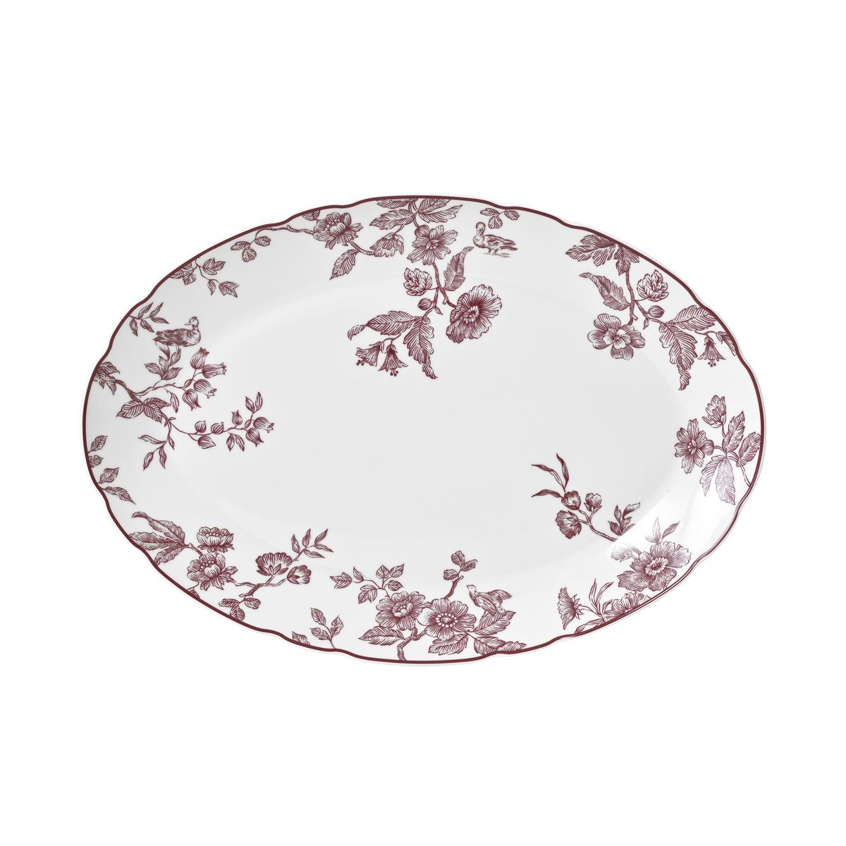 The warm plum hue – faithful to the traditional palette of Toile de Jouy fabrics – brings depth, sophistication and a contemporary richness to the décor. Graceful nature studies featuring chickadees, herons, ducks and pheasants unfold among blooming branches and lush foliage, evoking the abundance and generosity of nature. The finely drawn motifs appear almost lightly sketched, giving the table setting an artistic softness and effortless refinement.
