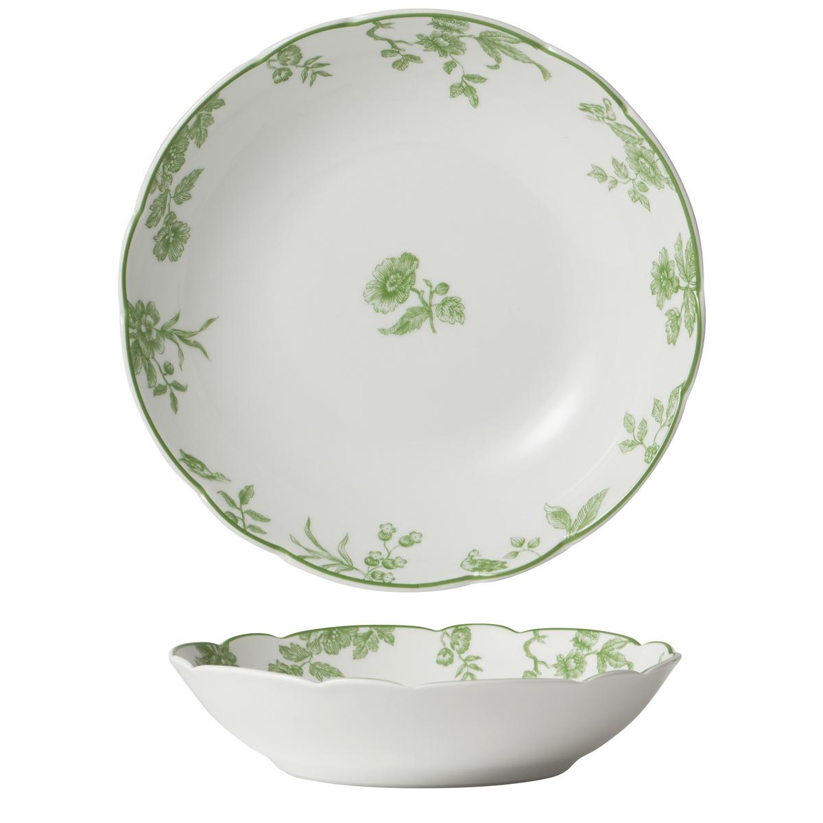 Inspired by the classic shapes of the 18th century, scalloped edges and playful details lend the service made of pure Limoges porcelain a charming vintage character. The bright, lush green decor in the Toile de Jouy style depict adorable titmice, herons, ducks, and pheasants frolicking in the fresh foliage of wild blackberries. Whether breakfast, lunch, teatime or dinner, whisk your guests away to a charming idyll in a modern country house style.