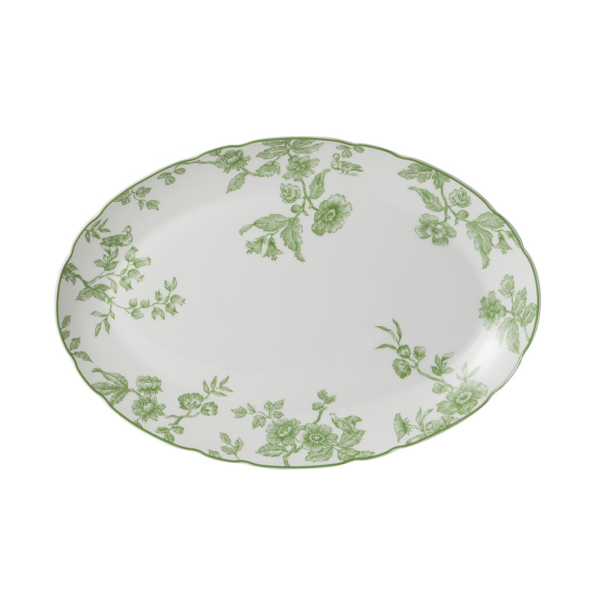 Inspired by the classic shapes of the 18th century, scalloped edges and playful details lend the service made of pure Limoges porcelain a charming vintage character. The bright, lush green decor in the Toile de Jouy style depict adorable titmice, herons, ducks, and pheasants frolicking in the fresh foliage of wild blackberries. Whether breakfast, lunch, teatime or dinner, whisk your guests away to a charming idyll in a modern country house style.