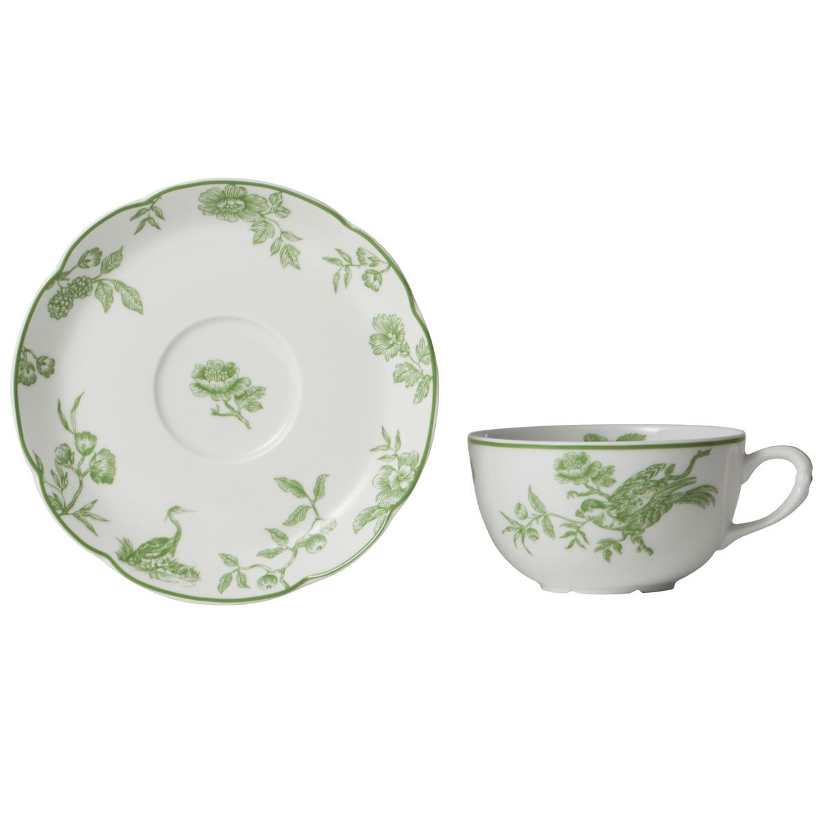 Inspired by the classic shapes of the 18th century, scalloped edges and playful details lend the service made of pure Limoges porcelain a charming vintage character. The bright, lush green decor in the Toile de Jouy style depict adorable titmice, herons, ducks, and pheasants frolicking in the fresh foliage of wild blackberries. Whether breakfast, lunch, teatime or dinner, whisk your guests away to a charming idyll in a modern country house style.